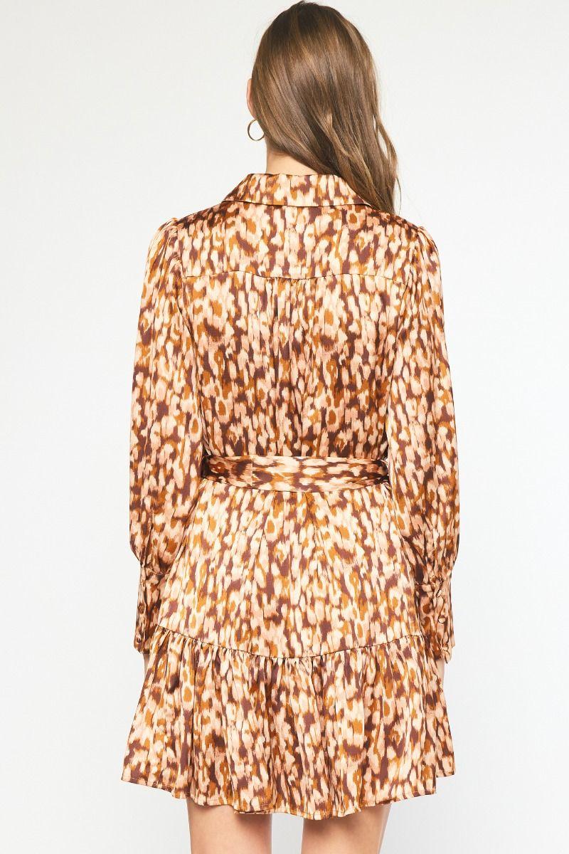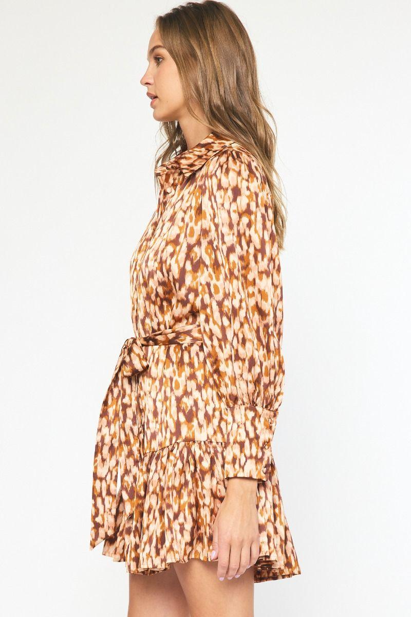 Printed collared button down long sleeve mini dress featuring removable belt. Lined. Woven. Non-sheer. Lightweight.