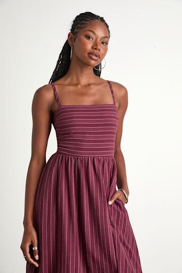 Feel free to poseLook picture-perfect every time you wear this striped midi dress. Lightweight, cotton-linen blend fabric shapes adjustable spaghetti straps, a sleeveless bodice, and a breezy A-line skirt with convenient side seam pockets. A tie-back detail secures atop the open back, completing the summer-ready design. Elastic at back for fit.