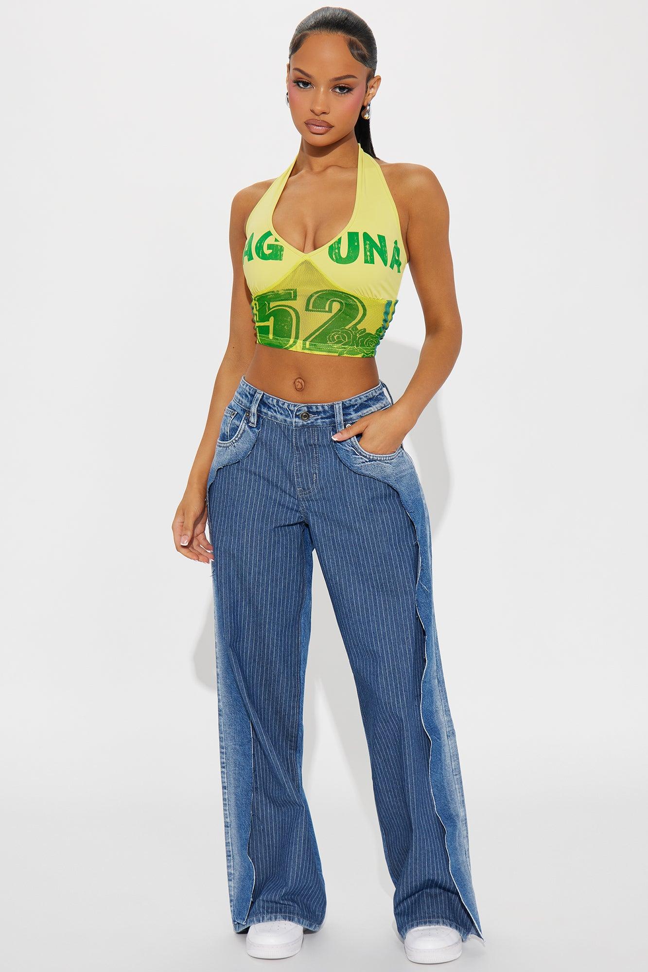 Available In Medium Wash. Wide Leg Jean 5 Pocket Raw Seam Detail Front Pinstripe Print Raw Hem 10.25" High Rise 32" Inseam Non Stretch Disclaimer: Due To The Specialized Wash Process, Each Garment Is Unique. 100% Cotton Imported
