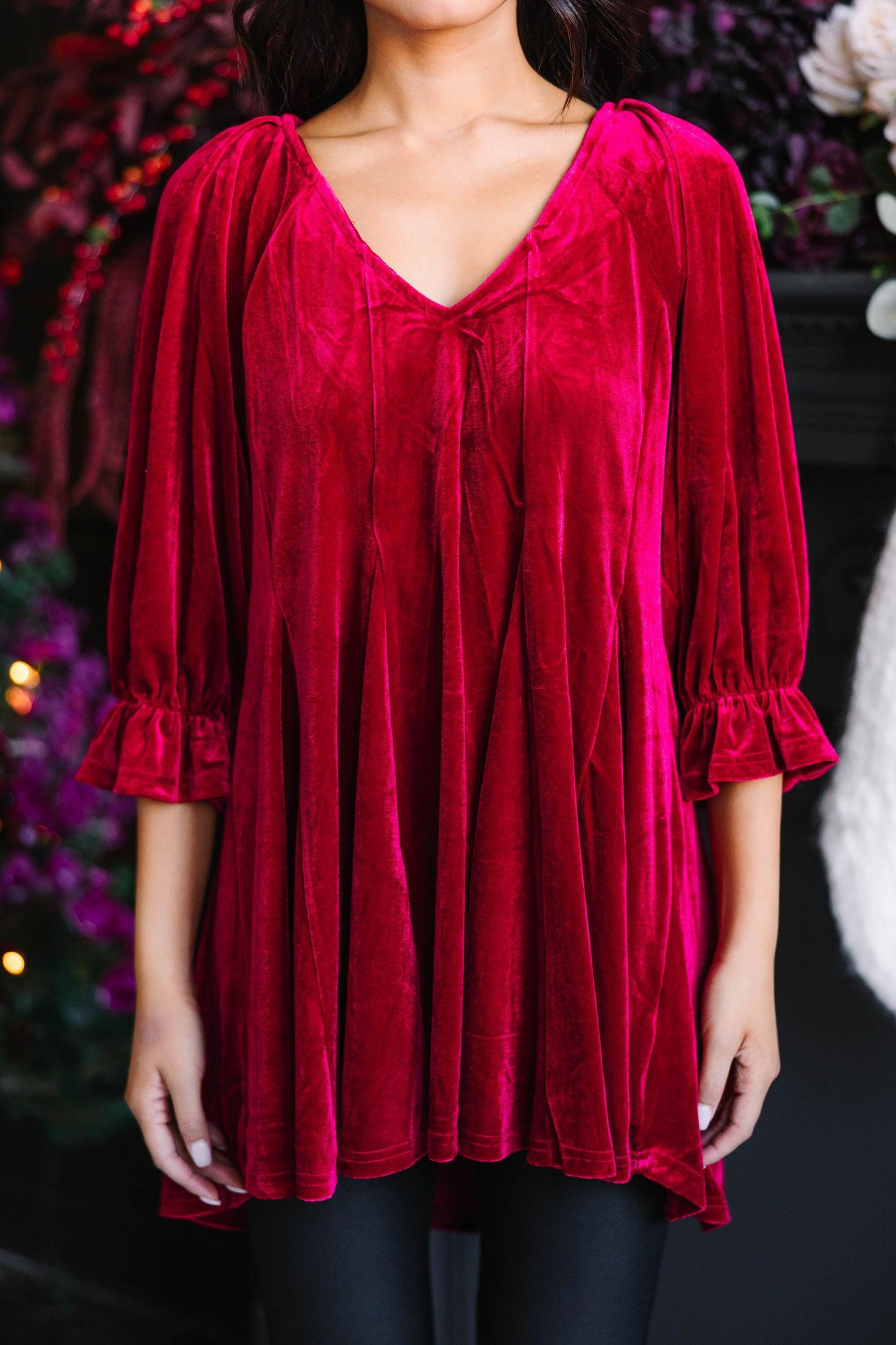 This little velvet tunic just feels like fun! That fabric is so soft and luxurious! We also love the casual, comfy of this tunic. You are going to love styling this tunic with jeans or leggings and boots for any day of the week! This tunic features 3/4 sleeves with elastic cuffs, a v-neck, and a velvet fabric. Material has a fair amount of stretch.Cindy is wearing the small.