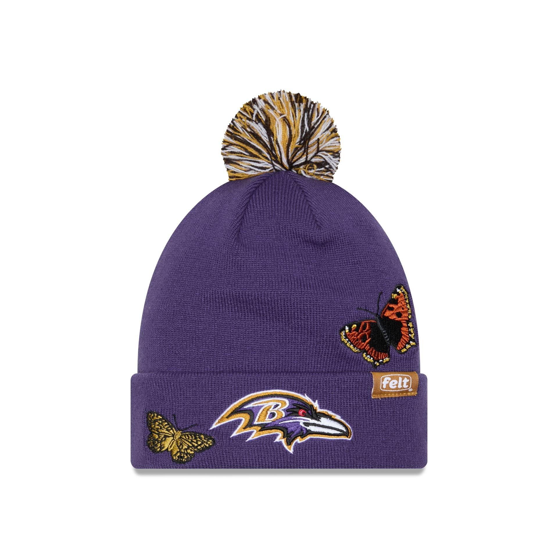 The FELT x Baltimore Ravens Pom Knit Hat features an embroidered Ravens logo and butterfly at the front cuff with a matching FELT tag. Additional details include nature inspired embroidery throughout the crown and a one-time removeable pom.