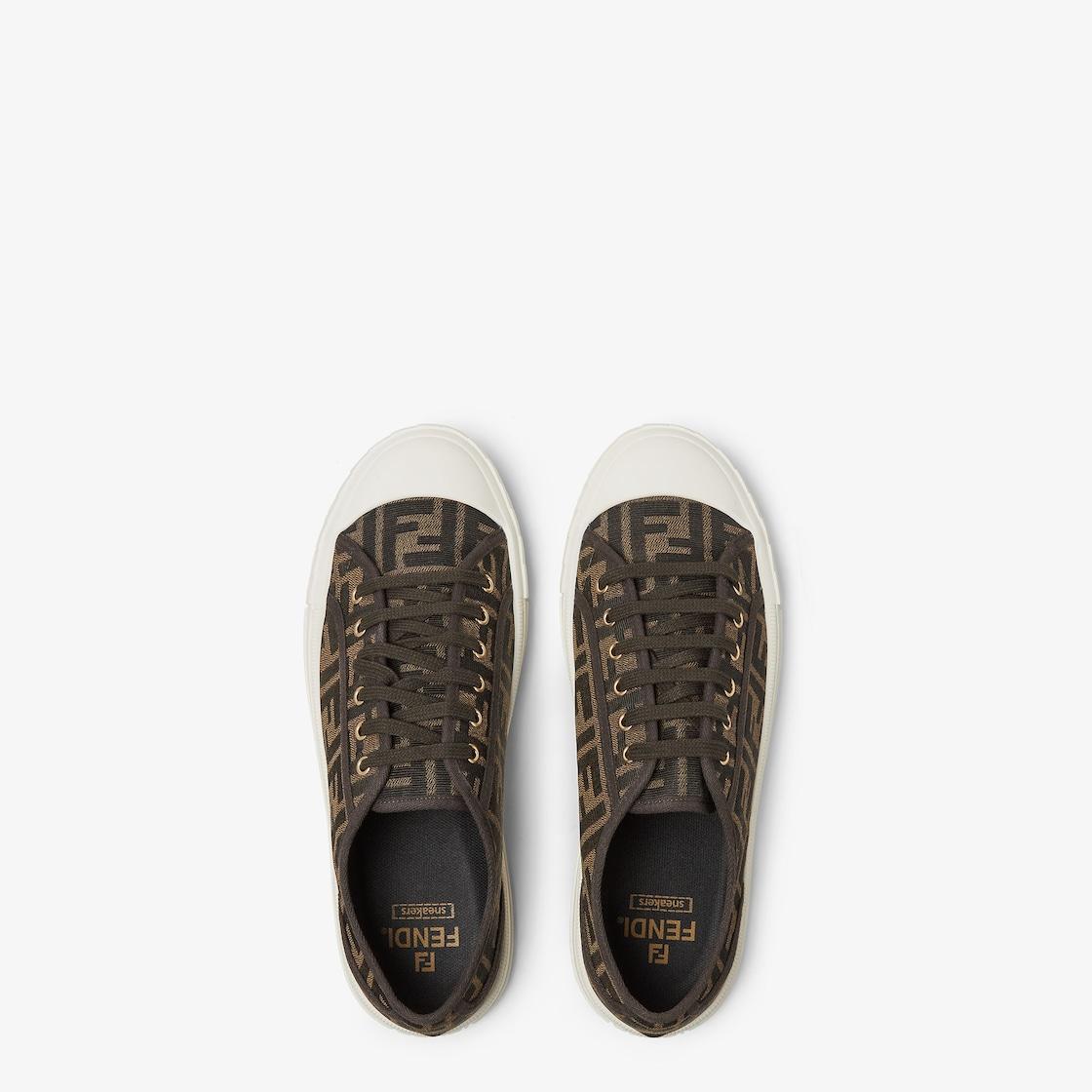 Compact, light design Fendi Domino sneakers. Made of fabric with jacquard FF motif in brown and tobacco. Rubber cupsole with embossed FF motif on the toe. Made in Italy