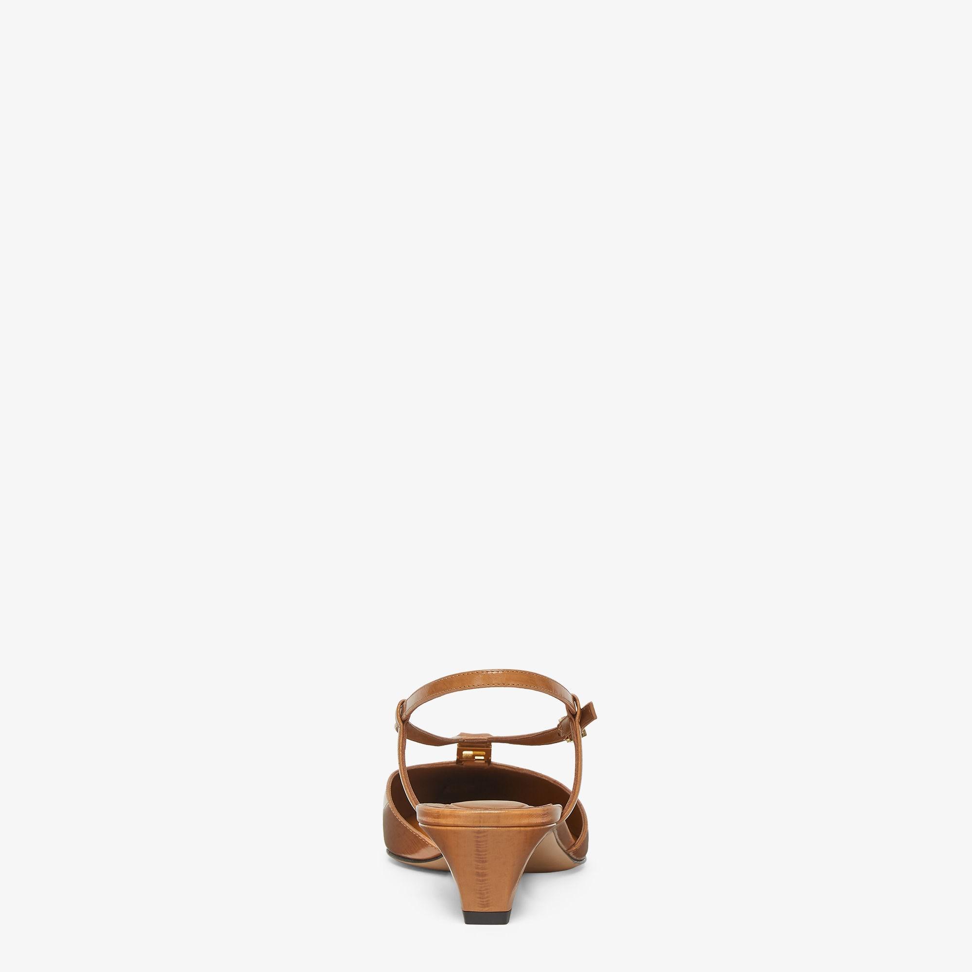 Slingbacks with square toe and straps that wrap around the foot. The metal FF detail, with a special design that includes a functional hinge in the center, makes them comfortable to walk in. Made of shiny beige eel leather. Tone-on-tone leather covered heel. Gold-finish metalware. Made in Italy