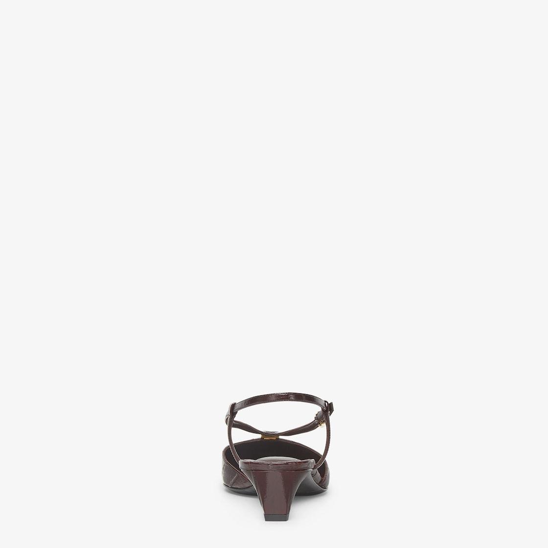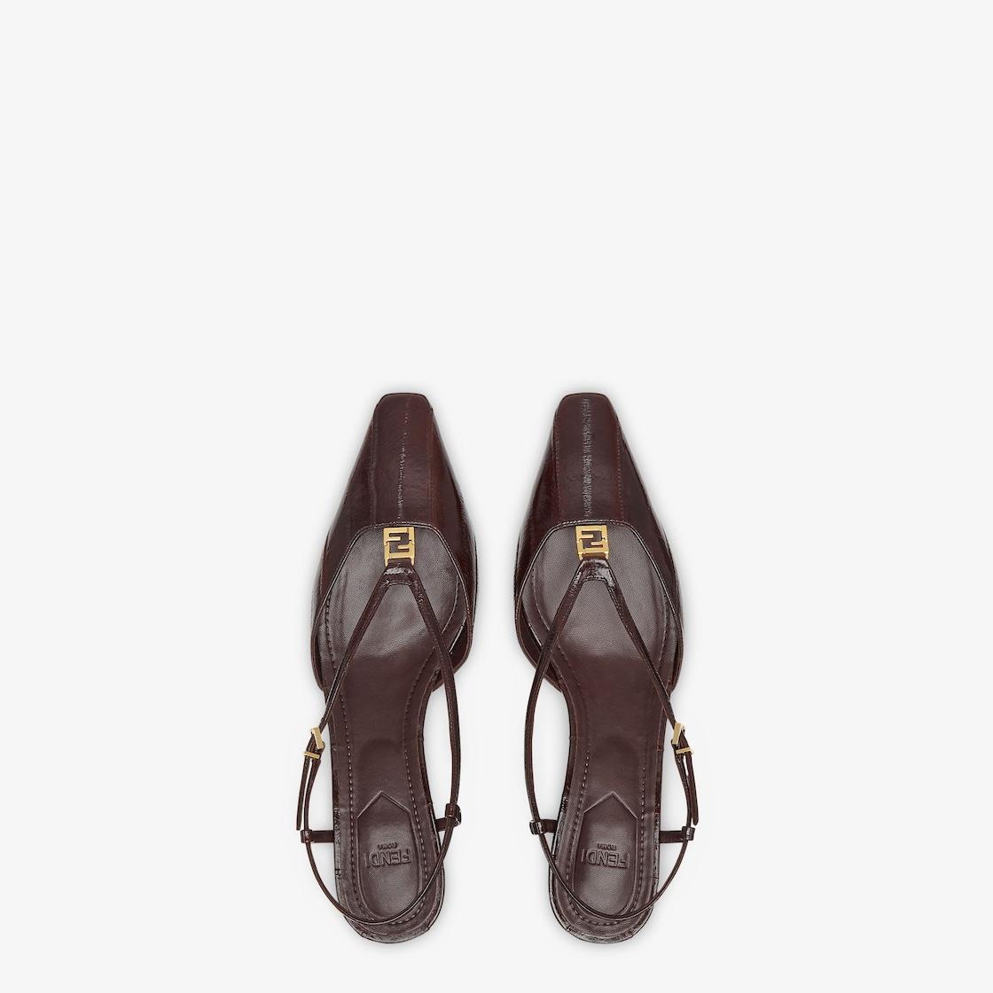 Slingbacks with square toe and straps that wrap around the foot. The metal FF detail, with a special design that includes a functional hinge in the center, makes them comfortable to walk in. Made of shiny brown eel leather. Tone-on-tone leather covered heel. Gold-finish metalware. Made in Italy