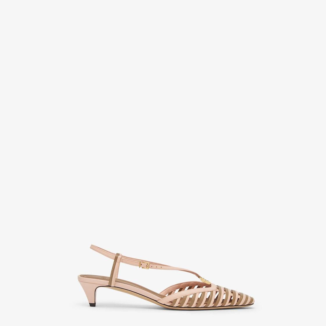 Slingbacks with square toe and straps that wrap around the foot. Embellished with a metal FF detail and featuring a special design that includes a functional hinge in the center. Made of pink and beige bonded leather strips. Matching leather covered heel. Gold-finish metalware. Made in Italy