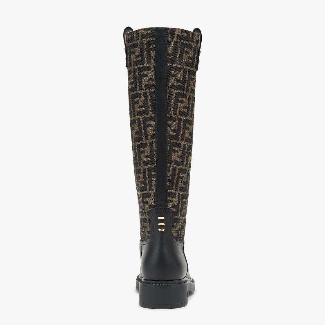 Tubular leg boots with round toe. Made of black leather. Leg made of jacquard fabric with an iconic brown FF motif. Embellished with metal Selleria stitching and metal embossed Fendi Roma lettering. Rubber sole and heel with Fendi lettering on the side. Gold-finish metalware. Made in Italy