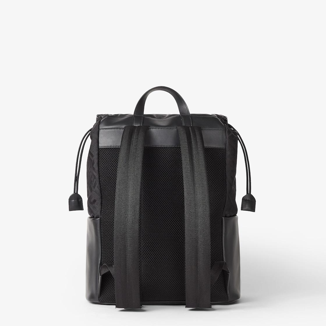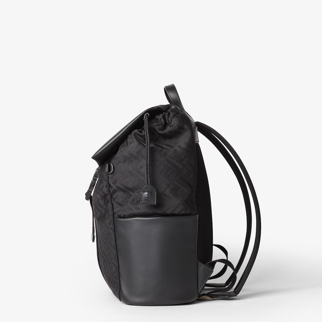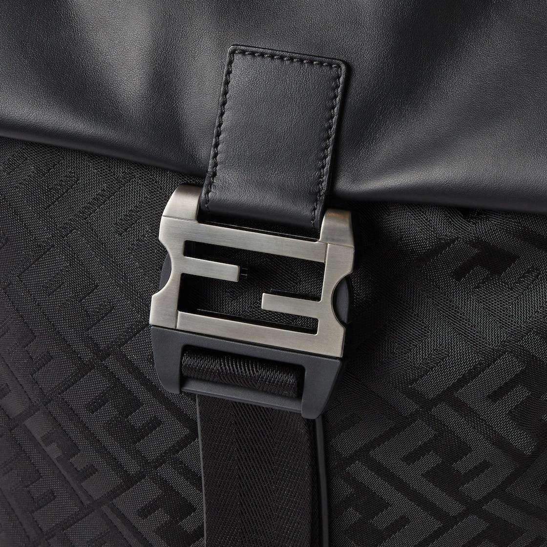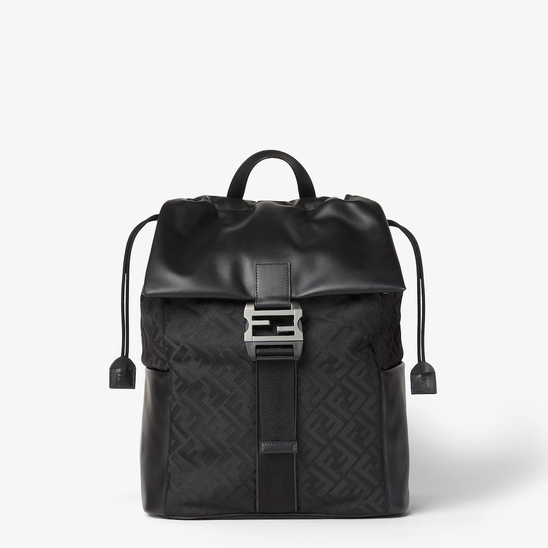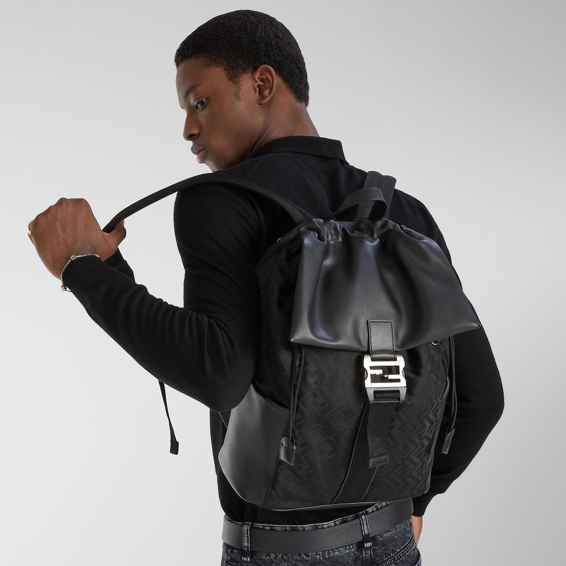 Fendi Flux backpack made of black padded FF nylon, with a luxurious and lightly embossed texture. Flap in smooth black calf leather, embellished with a metal FF clasp buckle closure. Large fabric-lined internal compartment with 13” laptop compartment, zipped pocket and drawstring closure, with customized cords and details details. Brushed ruthenium-finish metalware. Adjustable, padded black webbing and leather handle and straps. Large main compartment designed to hold a 13-inch laptop or tablet and everyday items. Made in Italy