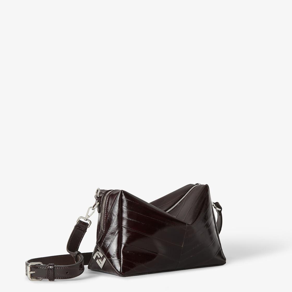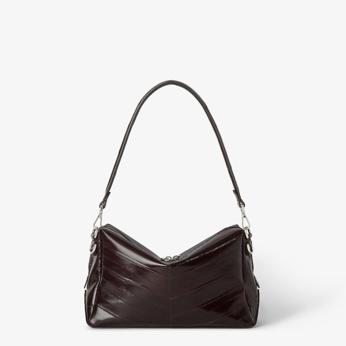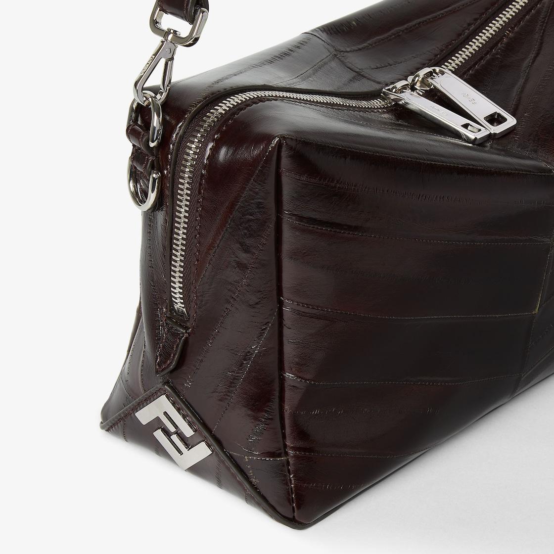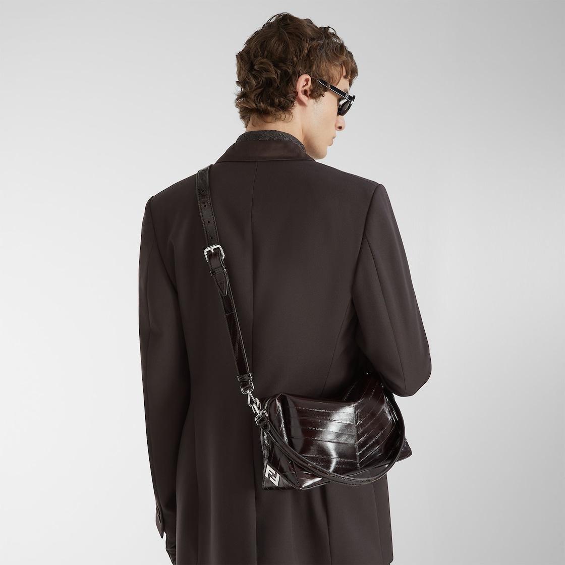 Medium Fendi Lui bag with a soft design, made of luxurious dark brown hagfish leather with a shiny finish and inlaid to create a chevron motif. The natural characteristics of the leather make each bag a unique piece. Decorated with a long zip fastening with double slider and FF metal appliqués on the corners. Fabric-lined internal compartment, inner flat pocket and metalware with palladium finish. The bag can be carried by hand or worn either on the shoulder or cross-body thanks to the removable handle and adjustable, detachable shoulder strap. Made in Italy