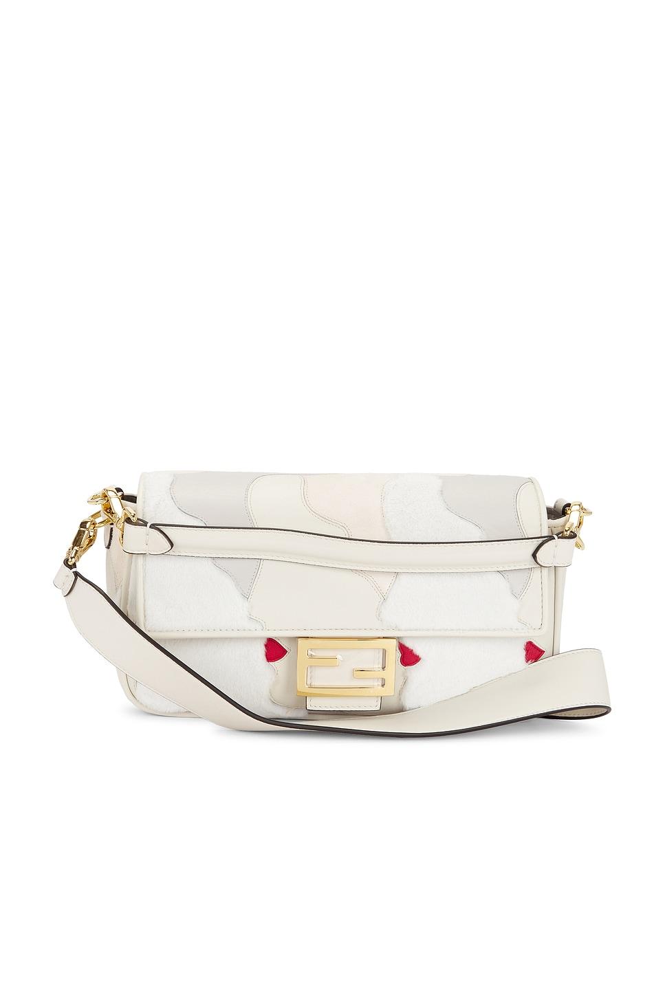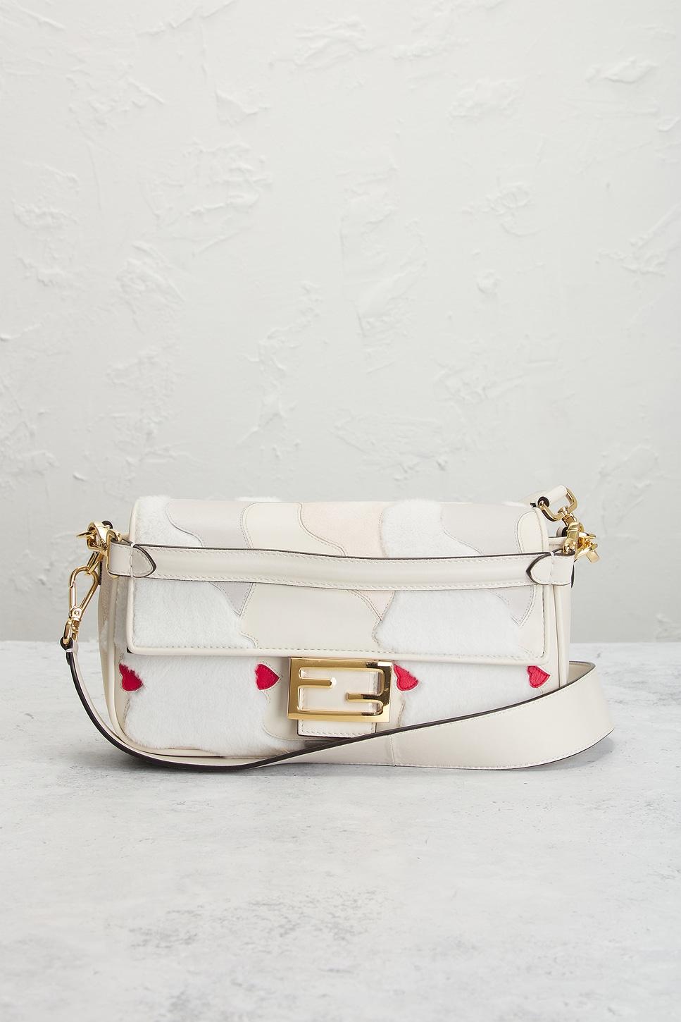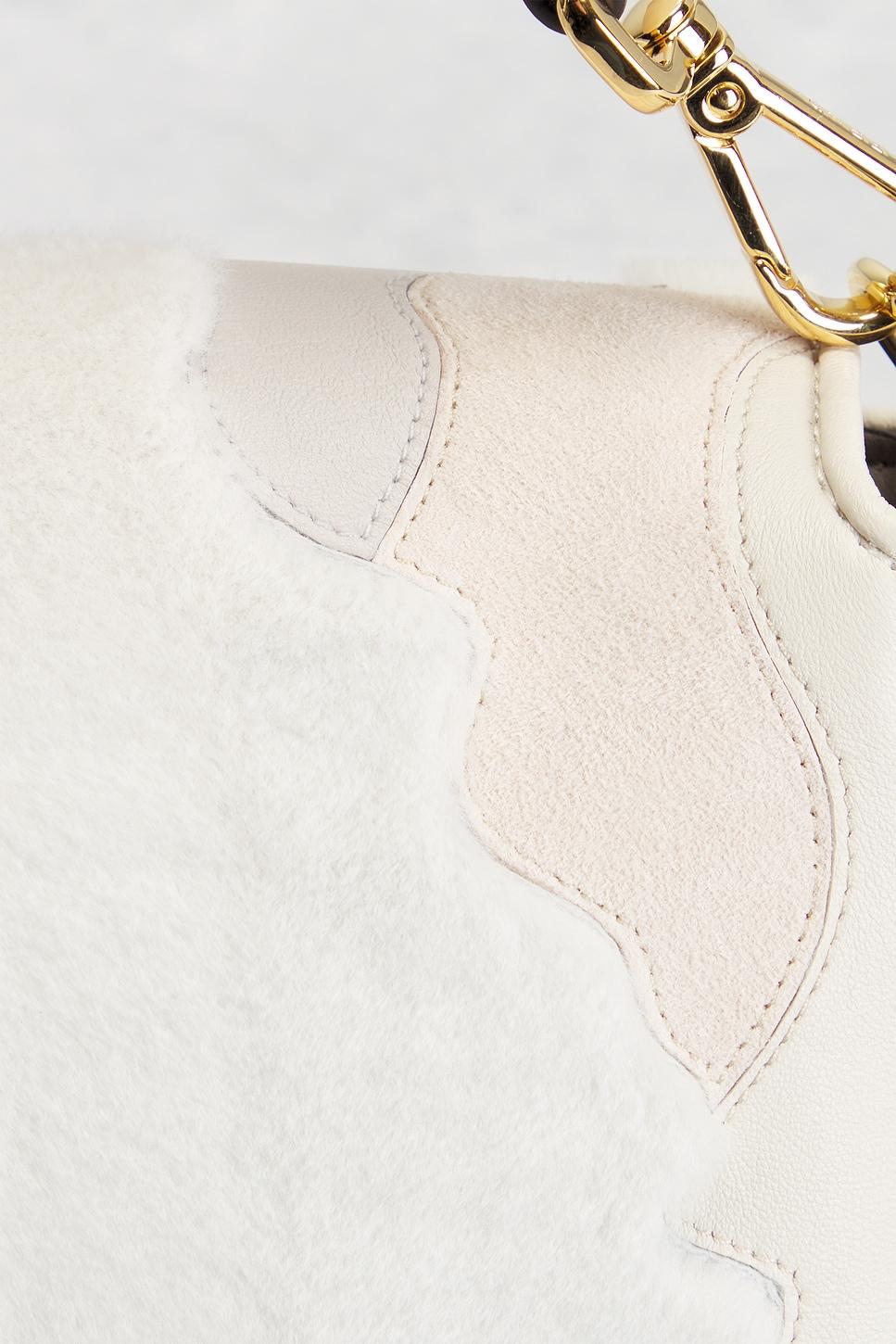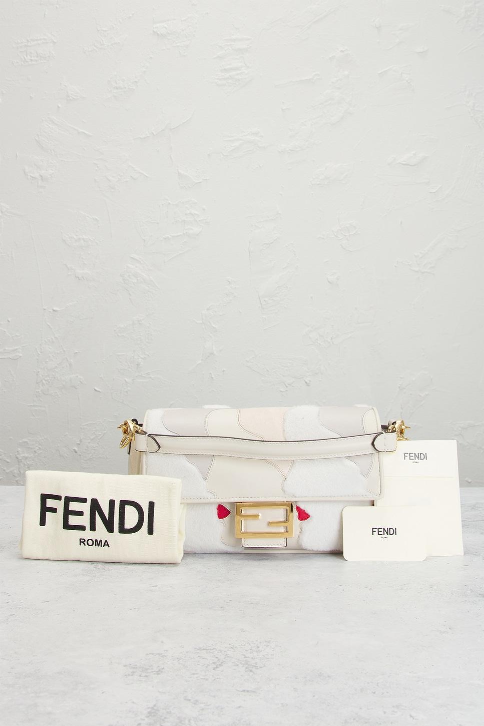 Photos are of the actual item.. Light scratches to hardware. Original brand box, authenticity card, and hang tag not included. Ivory calfskin leather with white shearling contrast and gold-tone hardware. Made in Italy. Magnetic snap closure. One main compartment with interior zip pocket. Heart detailing. Original dustbag, removable straps, material cards, and manufacturing card included. Measures approx 11" W x 6" H x 2" DTop handle with a 7" dropShoulder strap with a 17" drop. This product contains animal fur and may be subject to shipping restrictions based on your address at checkout. Our Style No. FNEF-WY5603. Manufacturer Style No. 10388411.