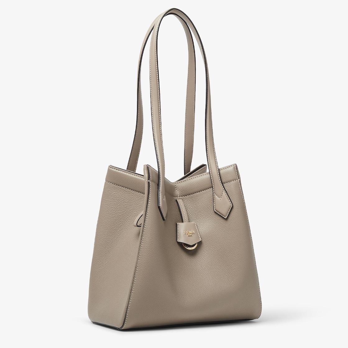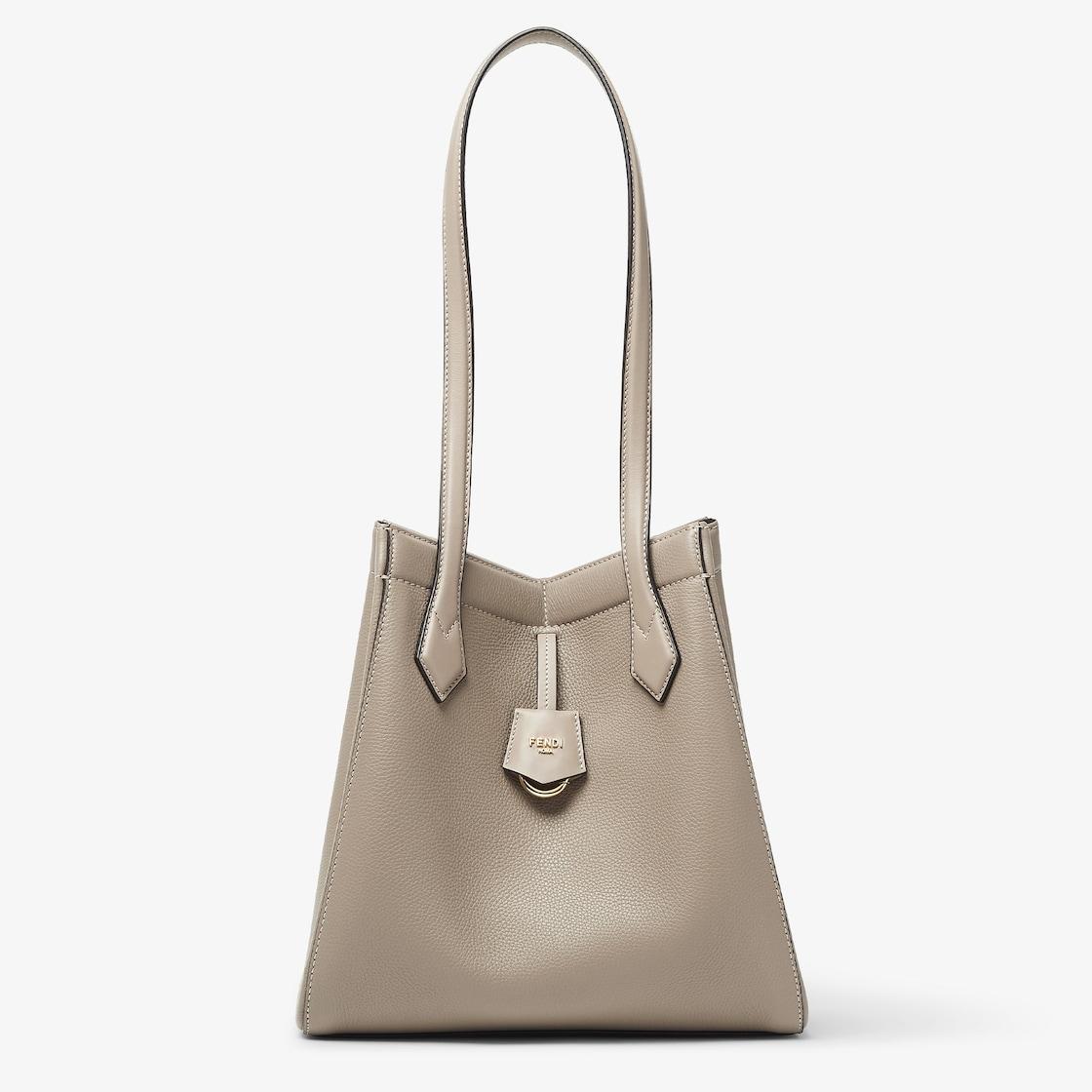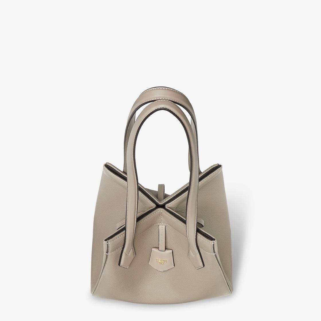 Medium Origami bag made of dove gray full-grain leather. The style recalls the creativity and dual nature of Fendi with an innovative design that can be transformed. Thanks to eight concealed magnets the bag can be styled as a shopper bag or bucket bag by folding it origami style. It comes with a key case charm with the word Fendi in metal. Lined inner compartment and gold-finish metalware. It can be carried by hand or worn on the shoulder thanks to 2 leather handles. Made in Italy