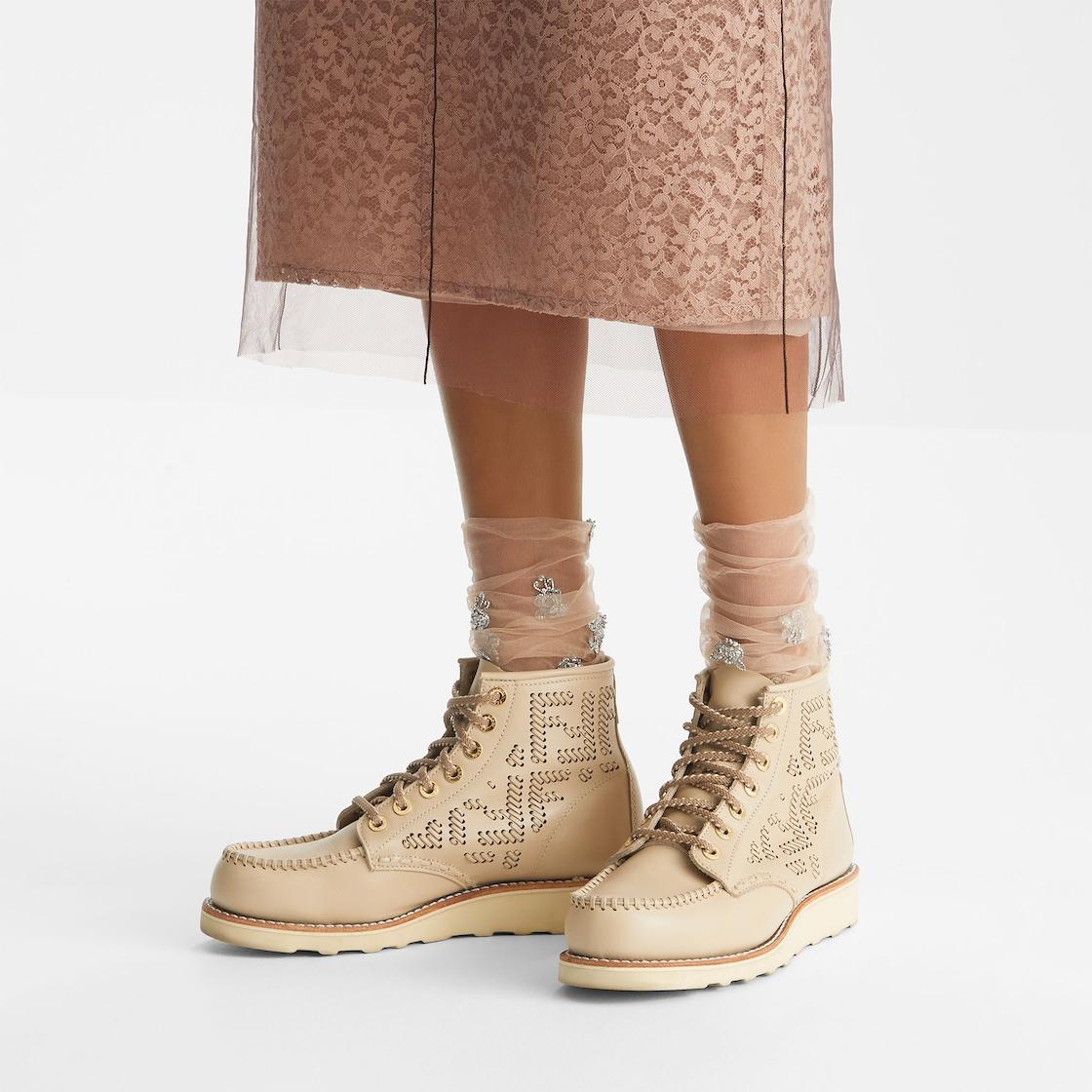 Lace-up ankle boots with signature loafer toe made in collaboration with Red Wing. Made of beige leather. The tone-on-tone threading on three sides is done entirely by hand and create the iconic FF motif. Two-tone cord laces in light brown tones. Goodyear-constructed sole with leather insole and white rubber tread. For this Fashion Show model, the materials are selected and crafted in Italy by Fendi artisans, then sent to the USA for assembly by the Red Wing experts. Made in Italy