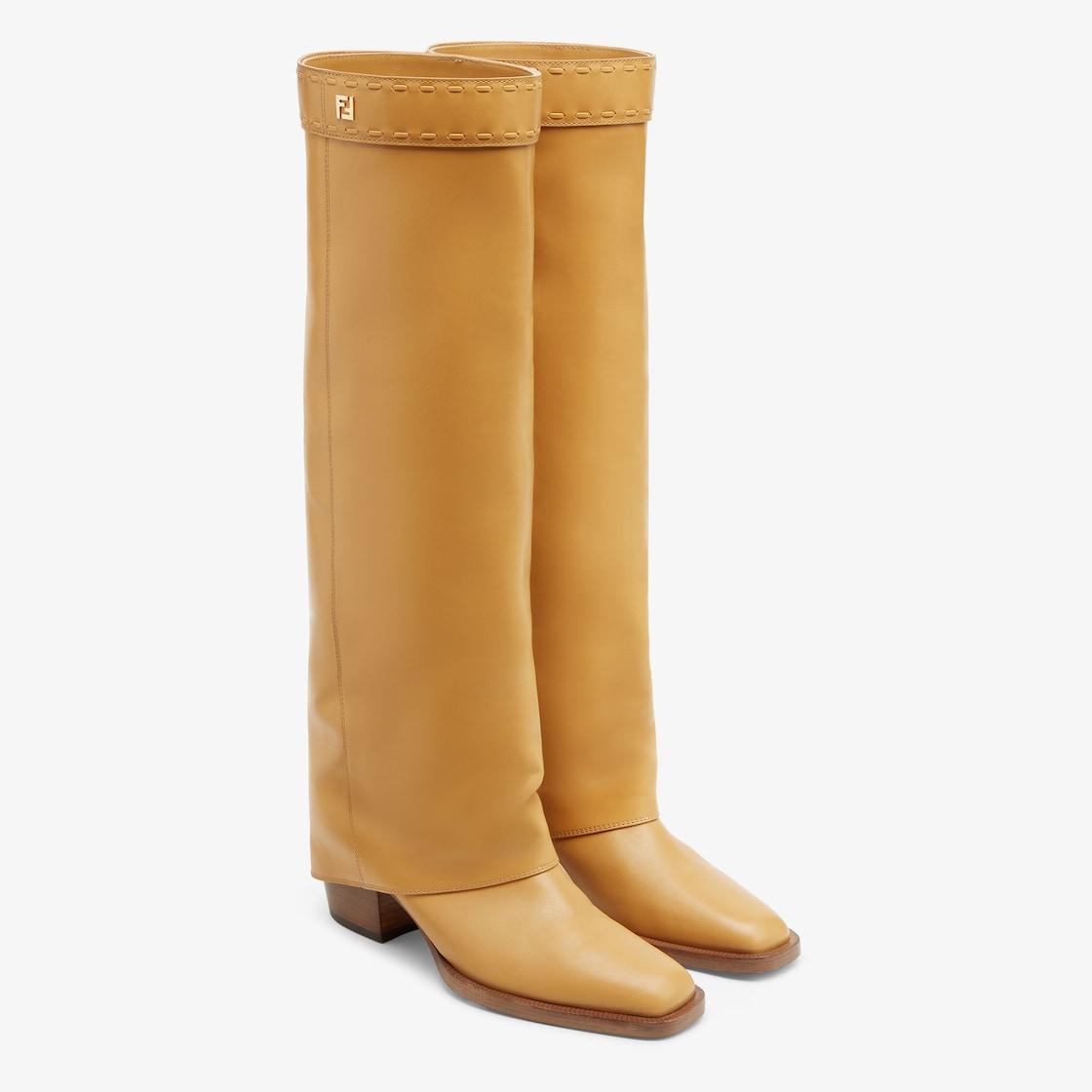 Square toe boots with tubular leg. Handmade in light beige leather. The leg partially covers the heel creating a trompe l'oeil effect and soft creases on the front. FF strap at the knee, finished with hand-sewn tone-on-tone macro Selleria topstitches, an emblem of the iconic Selleria workmanship handed down through generations of Fendi artisans since 1925. Made in Italy