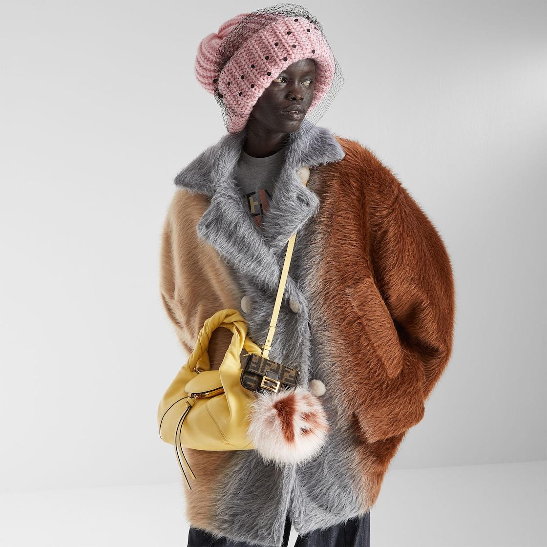 Small Fendi Spy Bag, a contemporary reinterpretation of a famous Fendi It bag presented in the Spring Summer 2005 Fashion Show, distinguished by its unique and unmistakable design. The name is inspired by the bag’s features, which include a secret pocket hidden in the flap that can be opened with a small button. An expression of fine craftsmanship, it features distinctive twisted handles that embellish the silhouette. Made of yellow calfskin. The round flap closure conceals a coin pocket and is trimmed in metal and has a knotted strap in tone-on-tone leather. Gold-colored hot-stamped FENDI ROMA logo. Featuring a tobacco-brown FF jacquard fabric-lined internal compartment and gold-finish metalware. The bag can be carried by hand, or worn either on the shoulder or cross-body thanks to the adjustable, detachable shoulder strap. Made in Italy
