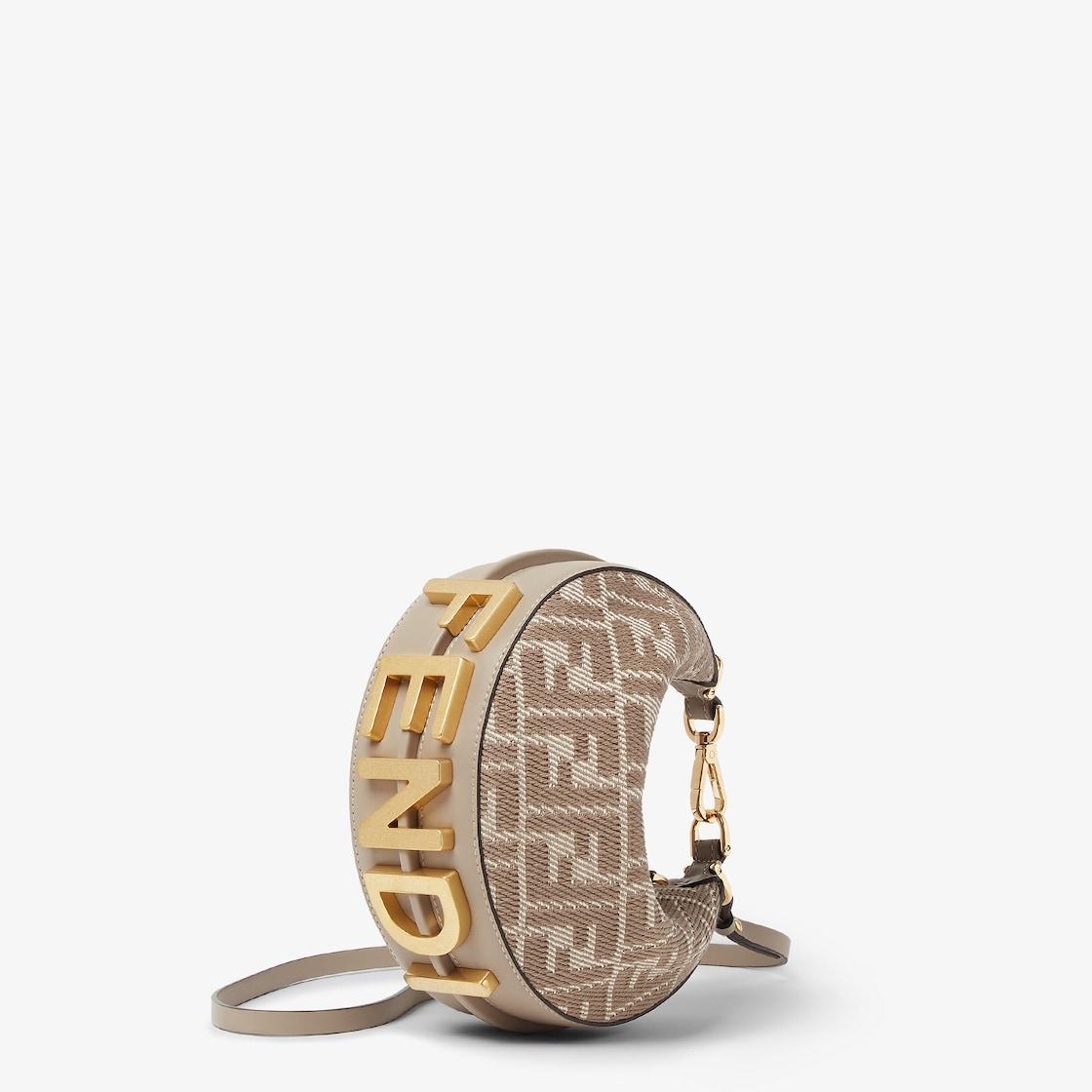 Mini Fendigraphy hobo bag with a contemporary look and bold details. Made of denim-effect FF jacquard in shades of dove gray, decorated with vintage gold metal FENDI lettering on the base, visible when the bag is worn. Zipper closure with a lined internal compartment, gold-finish metalware. It can be carried by hand by closing the bag with the clip or worn on the shoulder or cross-body using the adjustable, detachable dove gray leather shoulder strap inserted inside the side attachment points. Holds a 6.2-inch smartphone, Mini Trifold card holder or wallet, keys and lipstick. Made in Italy