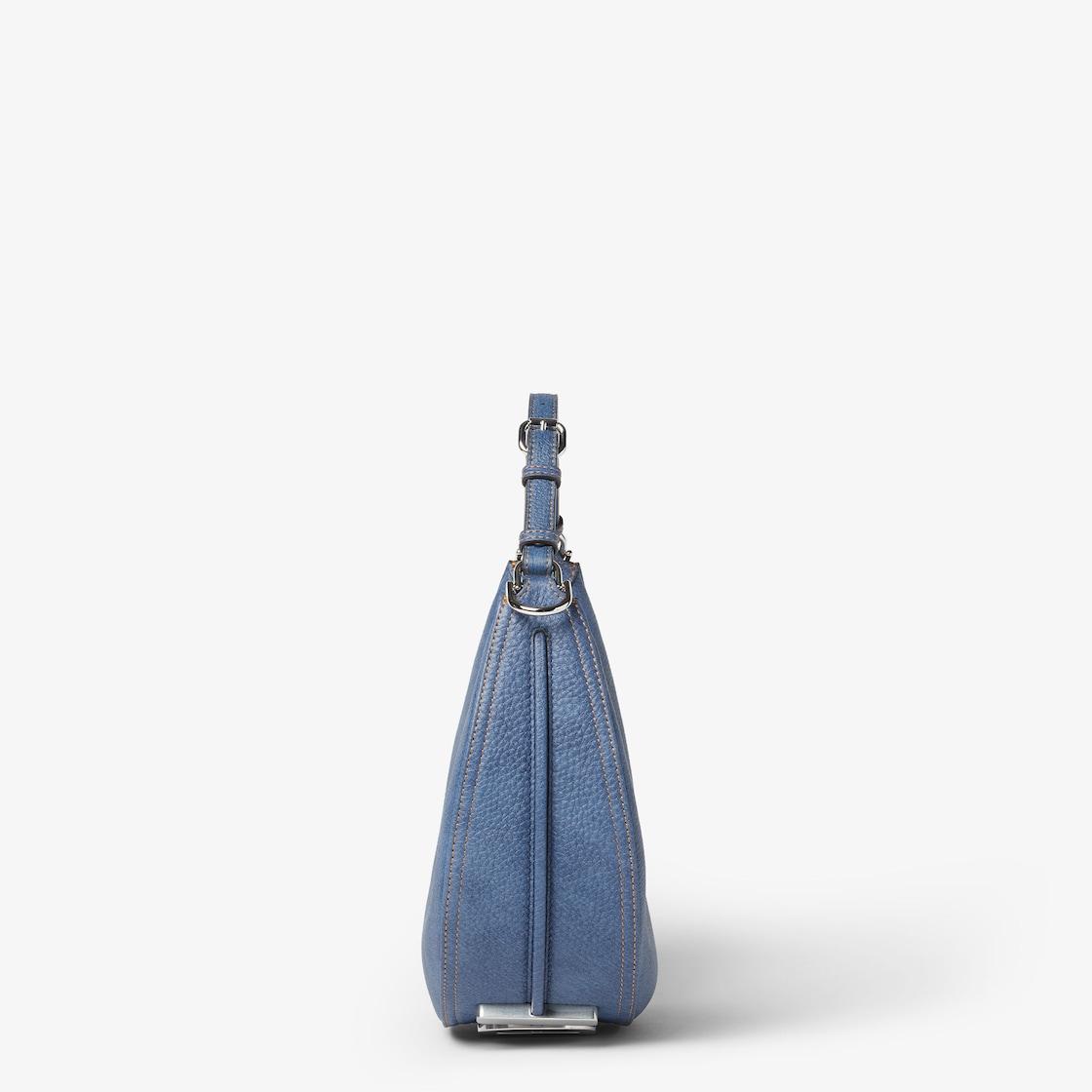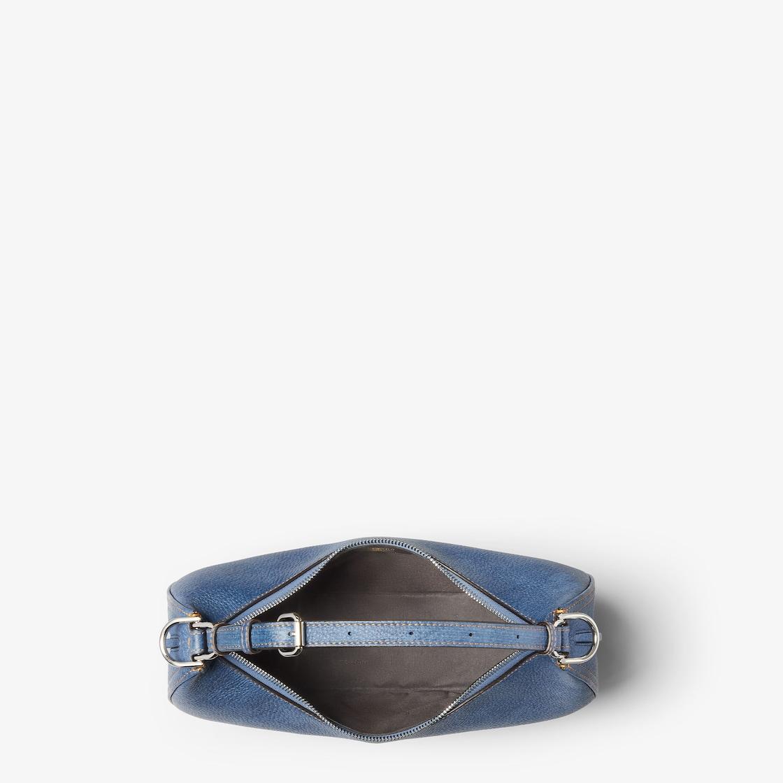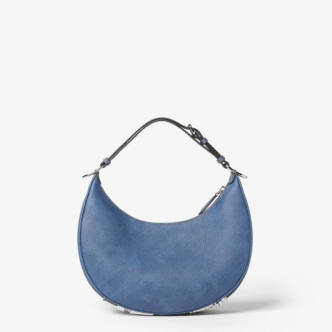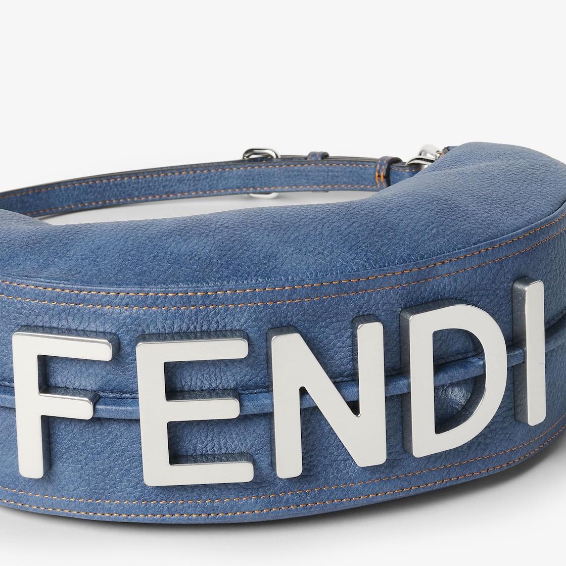 Small Fendigraphy hobo bag with a contemporary look and bold details. Made of blue Cuoio Romano leather, calfskin with a characteristic natural grain, produced with a metal-free tanning process and created with a special denim-effect finish. Embellished with FENDI lettering in palladium-finish metal on the base, visible when the bag is worn under the arm. Zipper closure with an lined internal compartment, palladium-finish metalware. It can be worn on the shoulder thanks to the adjustable, detachable handle in blue leather. Comes with hooks that allow a shoulder strap to be attached for wearing cross-body. Made in Italy