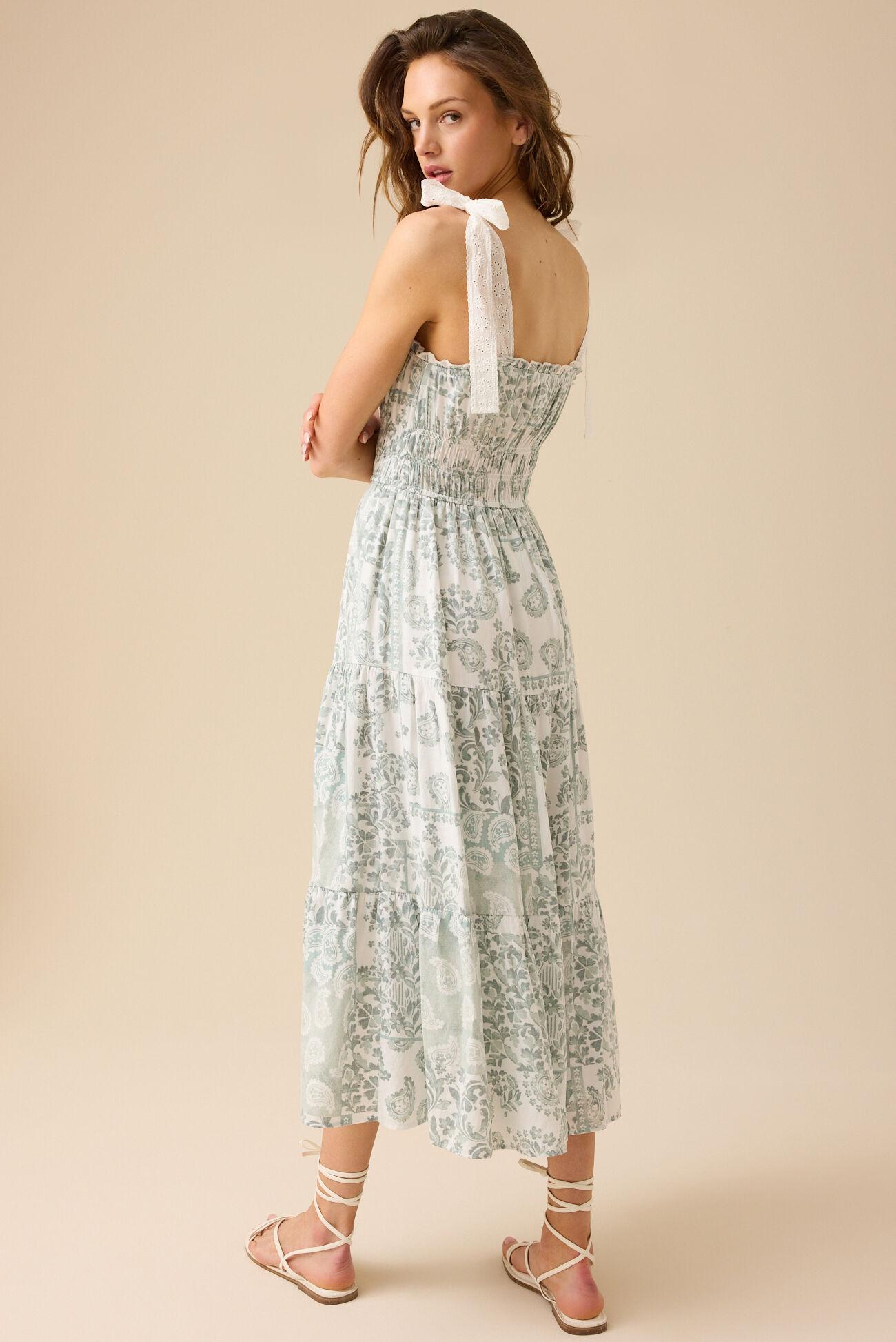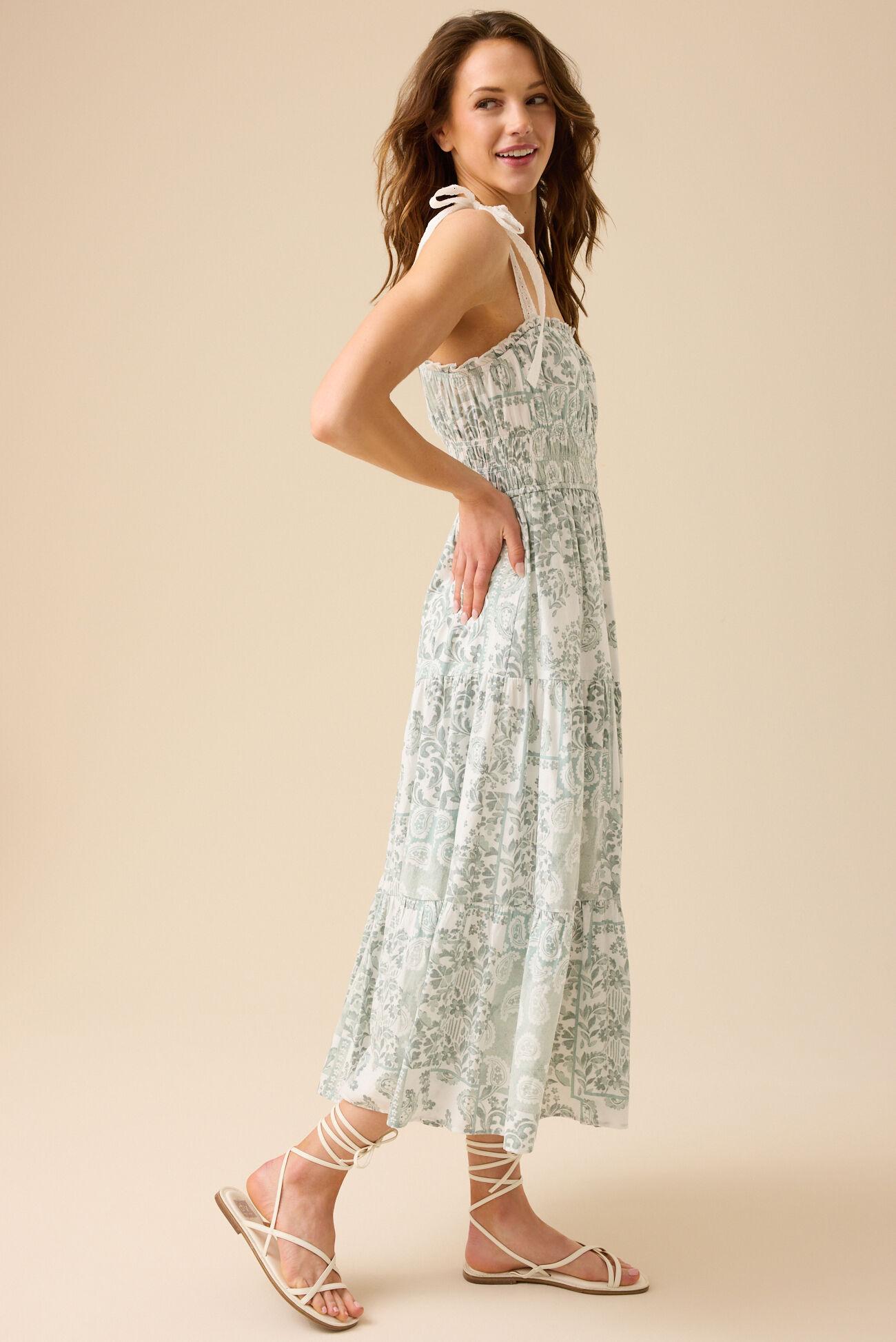 This maxi dress is effortlessly romantic, featuring delicate lace bow tie straps and a smocked waistband for a flattering fit. Flowing and feminine, it is perfect for any occasion.