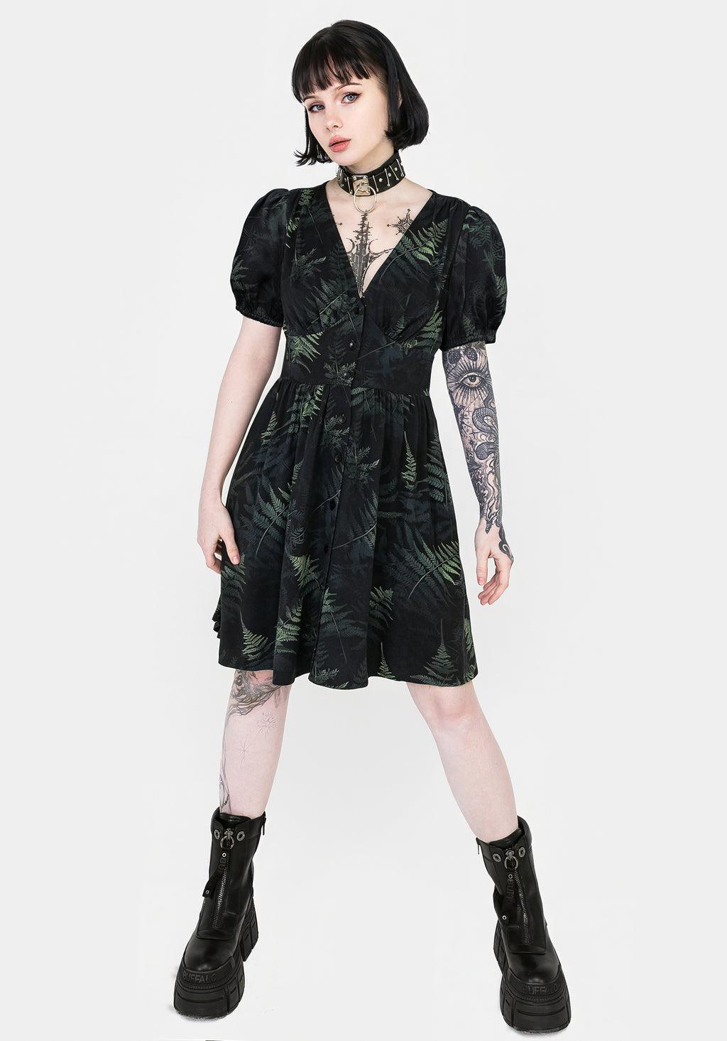 Nature calls - Black & green fern print button up mini dress - Flattering fit ‘n’ flare shape with a corset-inspired waist panelling - Plunging V-neckline feeds into functional buttoned front - Roomy short sleeves with defining gathered shoulders - Silky, breathable non-stretch fabrication - Dimensional green fern print on a rich black base - An unbe-leaf-able beauty! 100% rayon