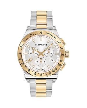Ferragamo 1927 mens watch Approx. 42mm two-tone case Yellow gold-toneplating over stainless steel Silvertone sunraydial with Tachymeter bezel Luminescent hands and baton time markers Features three round subdials Signature logo text at 12 oclock Square date window at 4 oclock Gancini logo at 8 oclock index Two-tone bracelet strap with a deployant buckle Chronograph movement Water resistant to 5 ATM Sapphire crystal window Spot clean Made in Switzerland