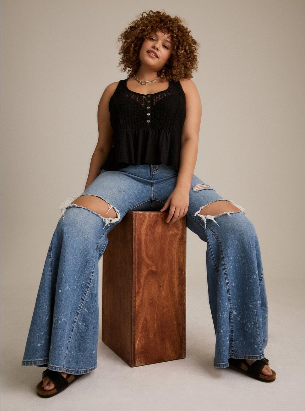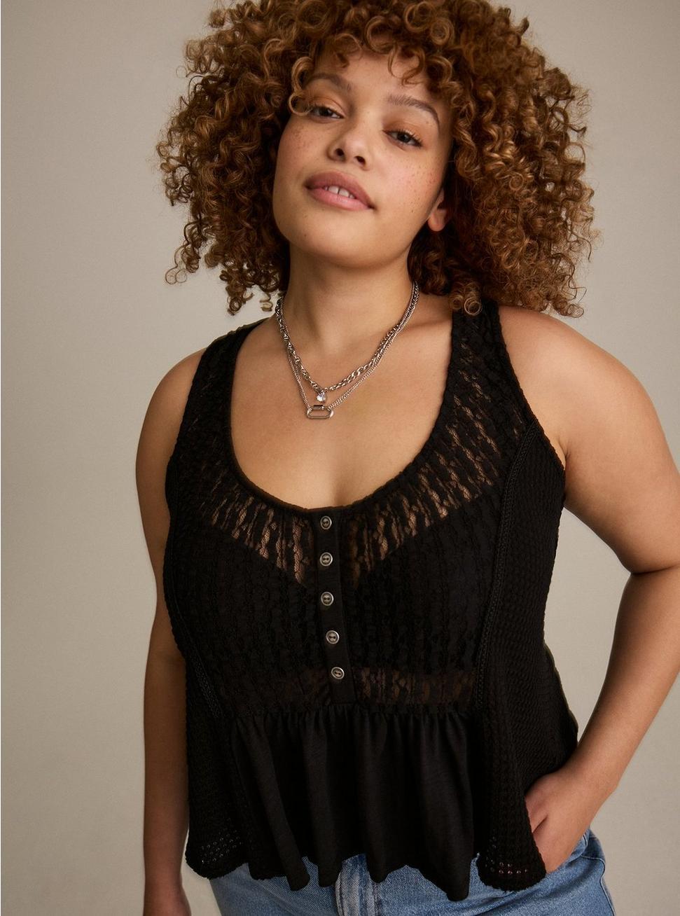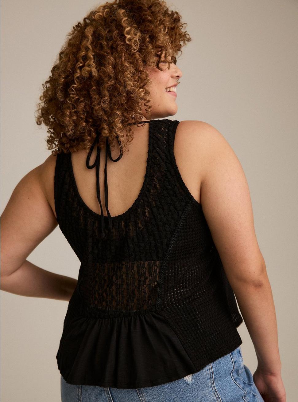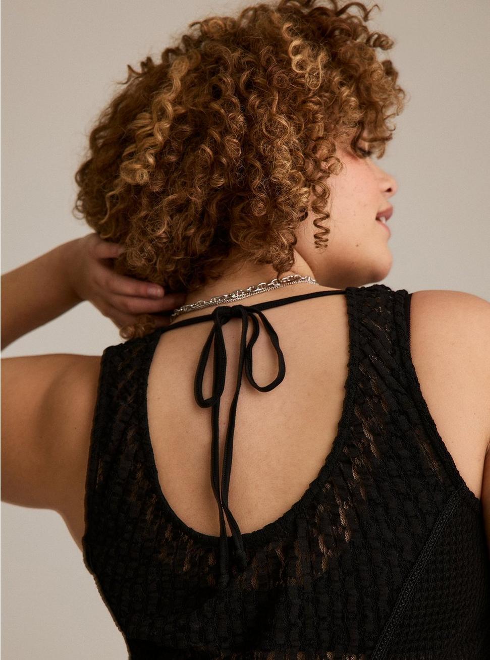 FITRelaxed fit. Measures 25'' from shoulder (size 2).MATERIALS + CARESlub jersey waffle knit fabric. 50% cotton, 45% nylon, 5% spandex.Machine wash cold. Line dry.Imported.DETAILSScoop neck.Sleeveless.Button front.Lace trim.Lived-in distressing at hem.Bow tie detail on back.FESTIBeautiful, evocative pieces for free spirits and the wild at heart. All dreamed up to tell your story. Your next adventure starts here.