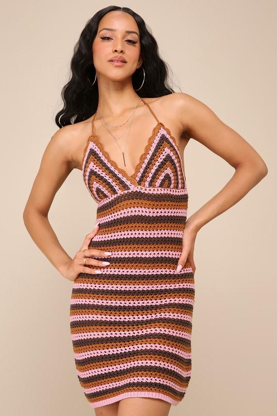 Stomp your feet to the sound of the beat looking cute as can be in the Lulus Festival Cutie Brown and Pink Striped Crochet Halter Mini Dress! This effortlessly cute dress features a crochet knit fabrication, with a striped design in hues of brown and pink, that shapes a tying halter neckline and a triangle-style bodice. Figure-skimming silhouette continues into a fitted skirt that ends at a mini hem. Open back design lends a flirty finish!