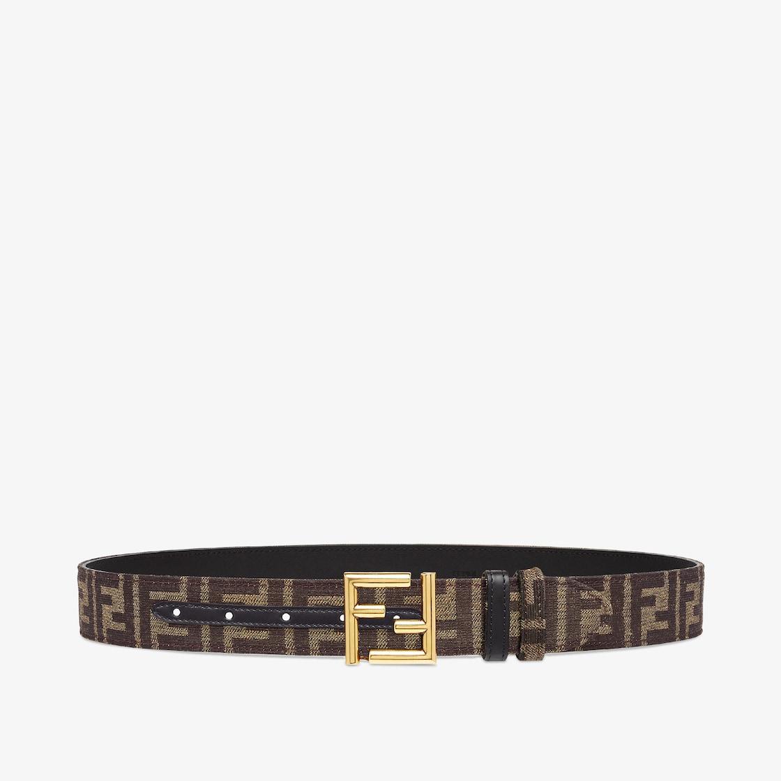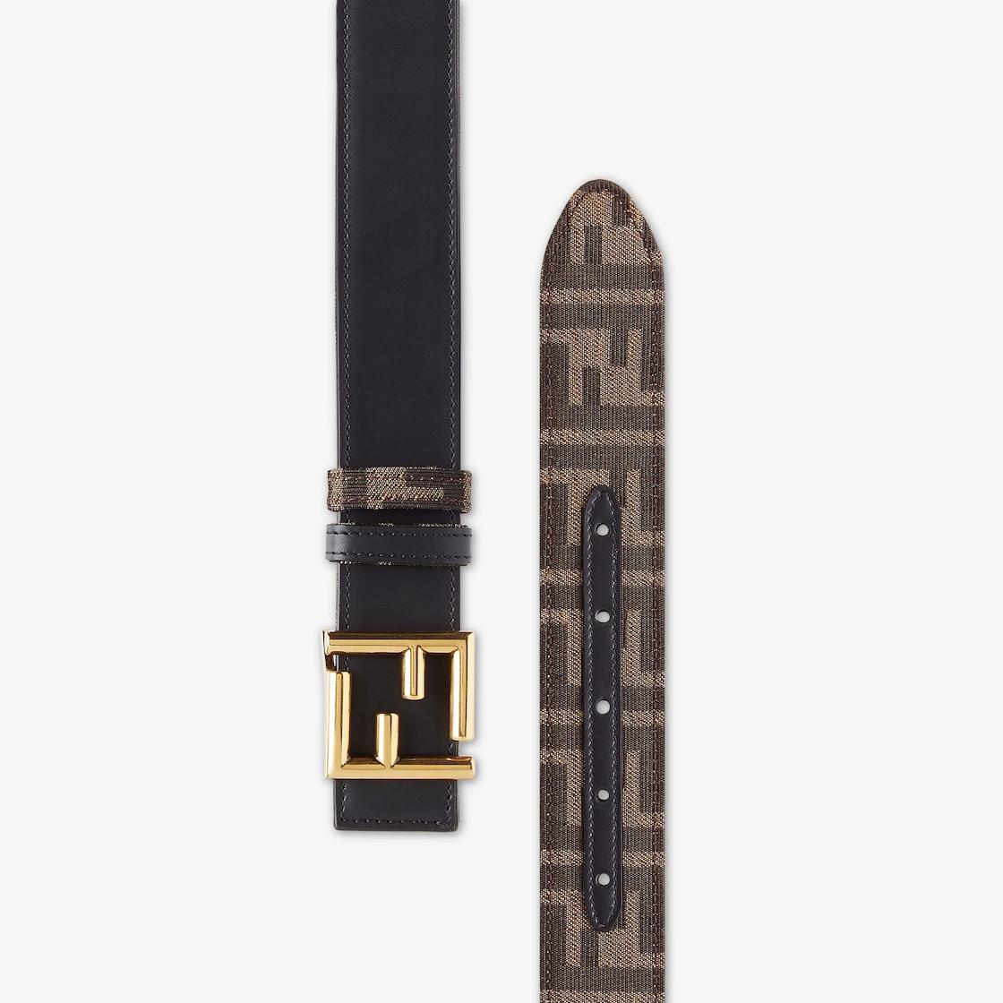 Reversible belt with loop and iconic FF stud buckle. Made of black leather on one side and fabric with the FF motif in brown and tobacco on the other side. Gold-finish metalware. Made in Italy