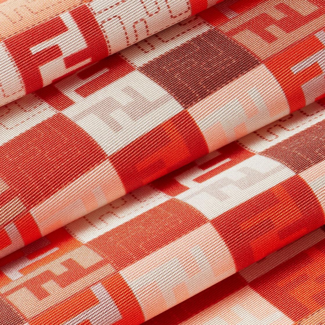 Square silk foulard. Decorated with a pattern of geometric shapes and micro FF logos in colors such as red, pink and beige, for a dynamic visual effect. Framed by color-block stripes. Made in Italy