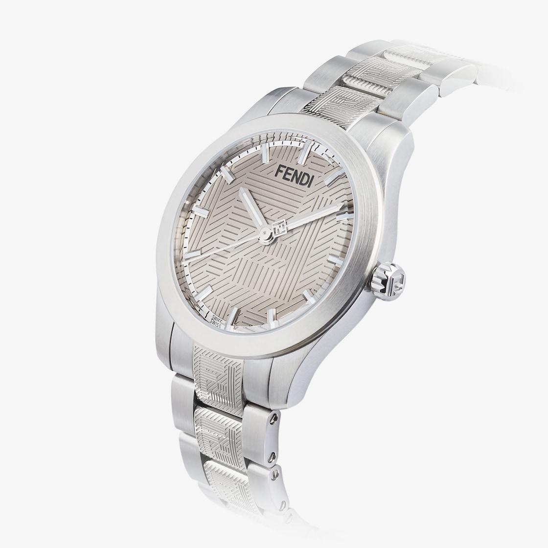 40-mm round case in satin-finish silver-color stainless steel with shiny details on the side. Brushed finish on the bezel and shiny crown with raised FF logo. Light gray sunray dial with engraved FF Shadow motif, silver indices and hands with LumiNova C1 and silver-color Fendi logo. Brushed silver-color stainless steel 20/18-mm bracelet, polished central links with engraved FF motif and folding buckle.