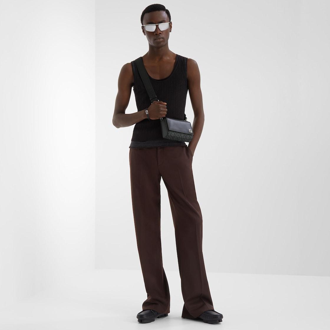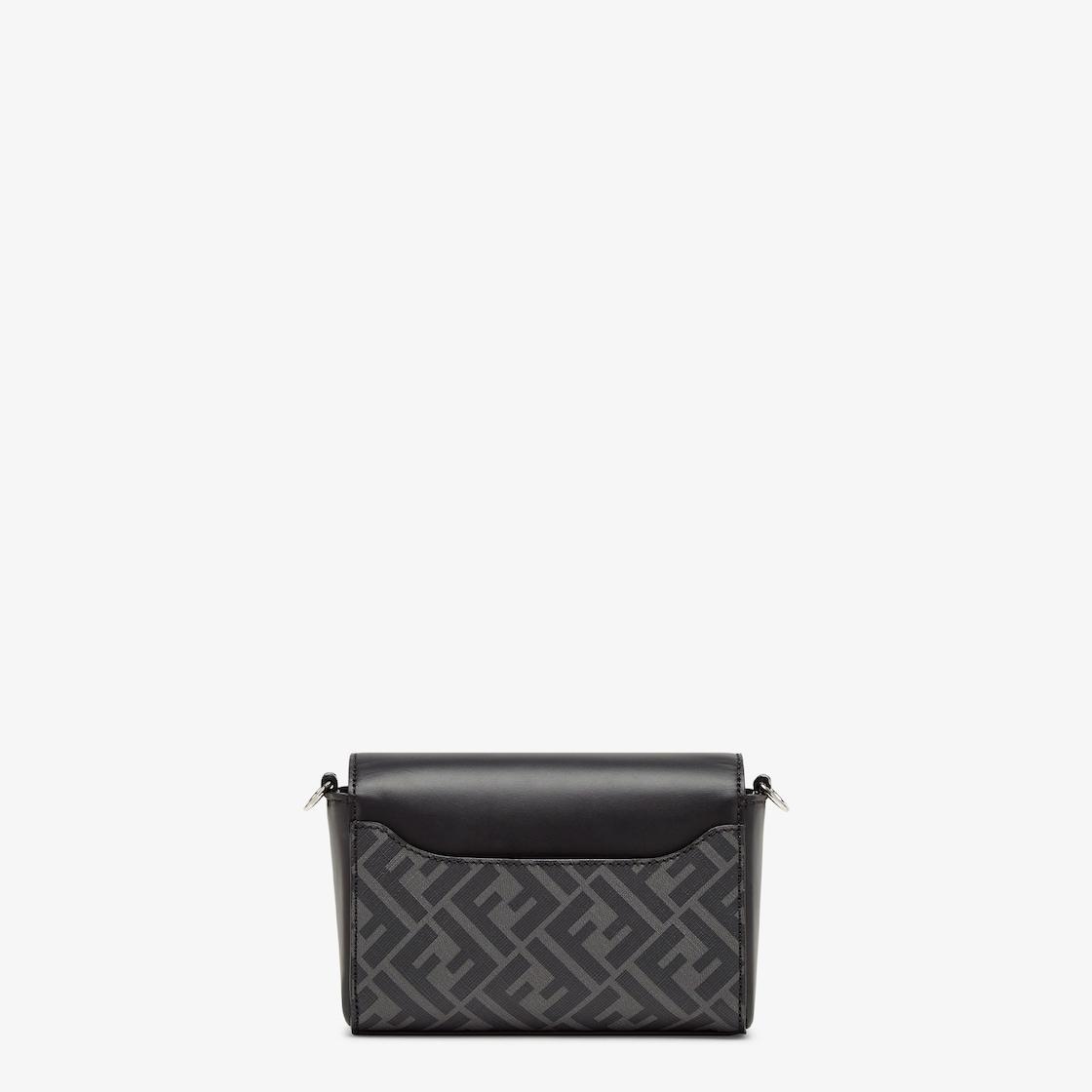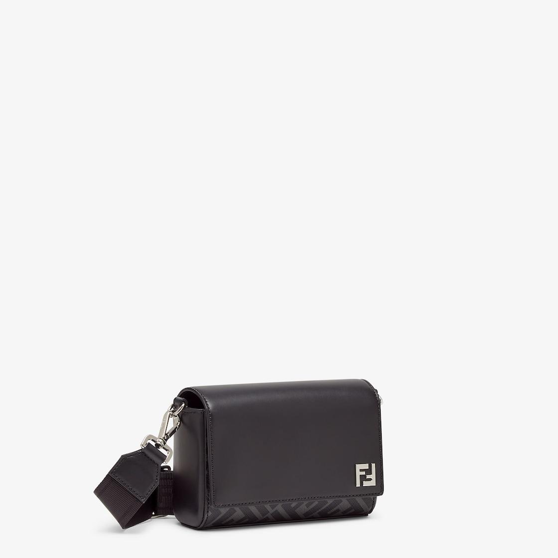 Compact messenger bag made of black leather and black FF canvas. Closed with magnetic flap, decorated with metal FF appliqué. Flat outside pocket, one lined internal compartment with zipper pocket and palladium-finish metalware. Technical fabric cross-body shoulder strap with FENDI lettering that is adjustable and detachable. Made in Italy