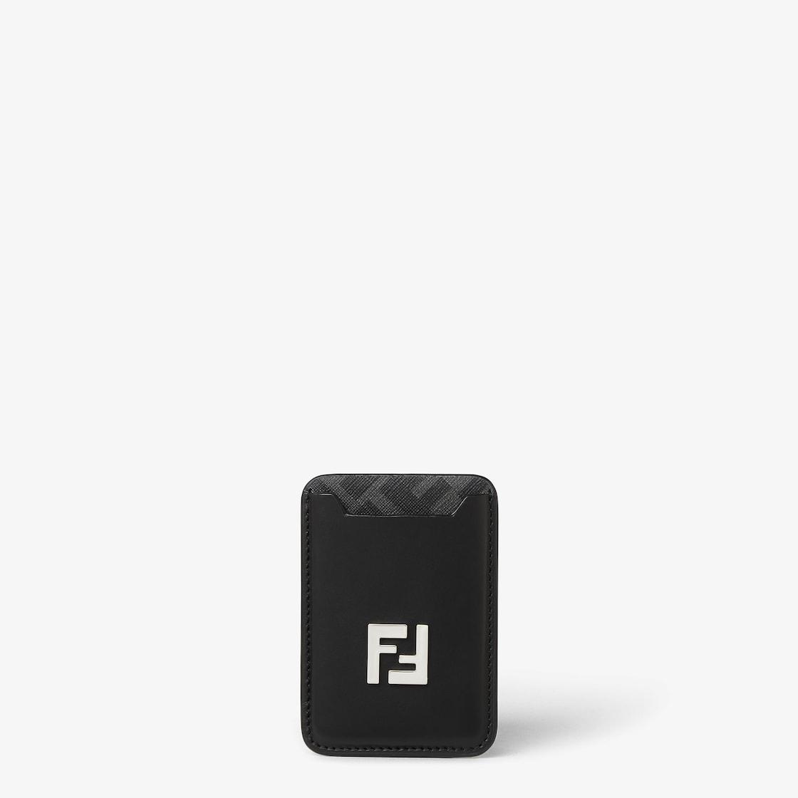 Card case with a central flat pocket that holds up to three cards using a magnetic system (MagSafe) on the back that sticks to your smartphone. Made of black leather with black FF Canvas details. Metal FF Squared motif with shiny palladium finish. Made in Italy