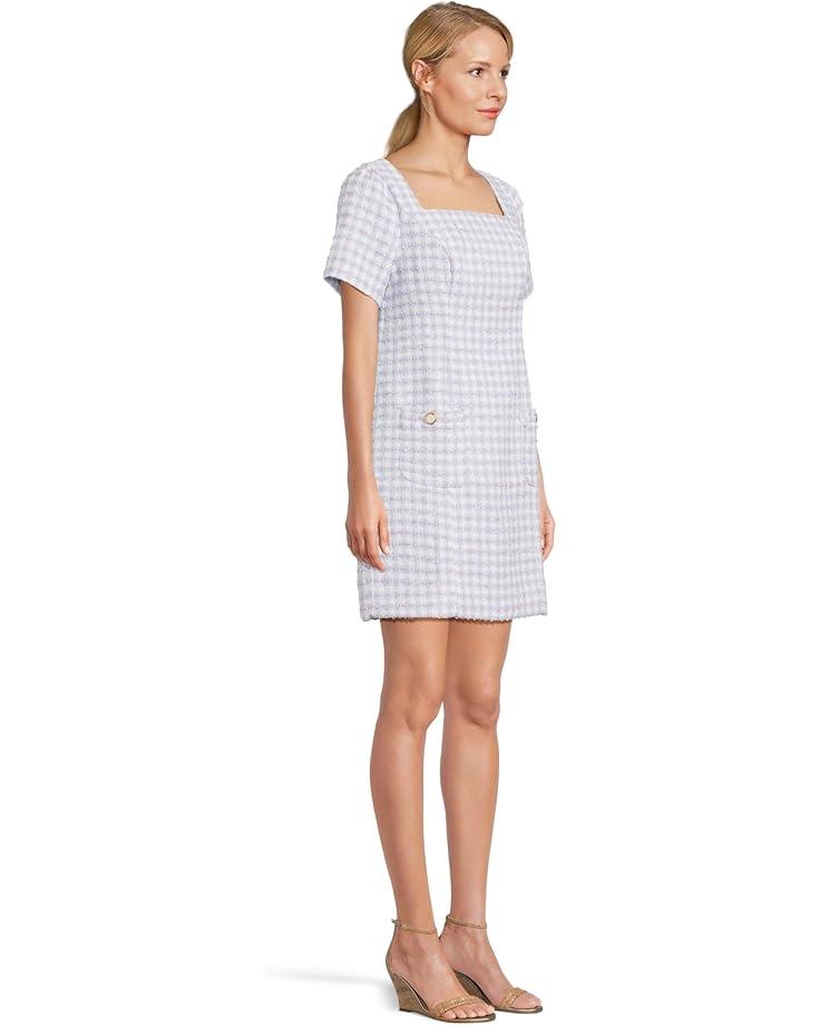 Your simplicity and grace will make heads turn at the next occasion as you dress up in the Lilly Pulitzer® Gwynne Boucle Shift Dress. The pull-on style shift dress features a squared neckline, short sleeves, two patch pockets with button detail at the front, an allover checkered print, and an above-the-knee silhouette.