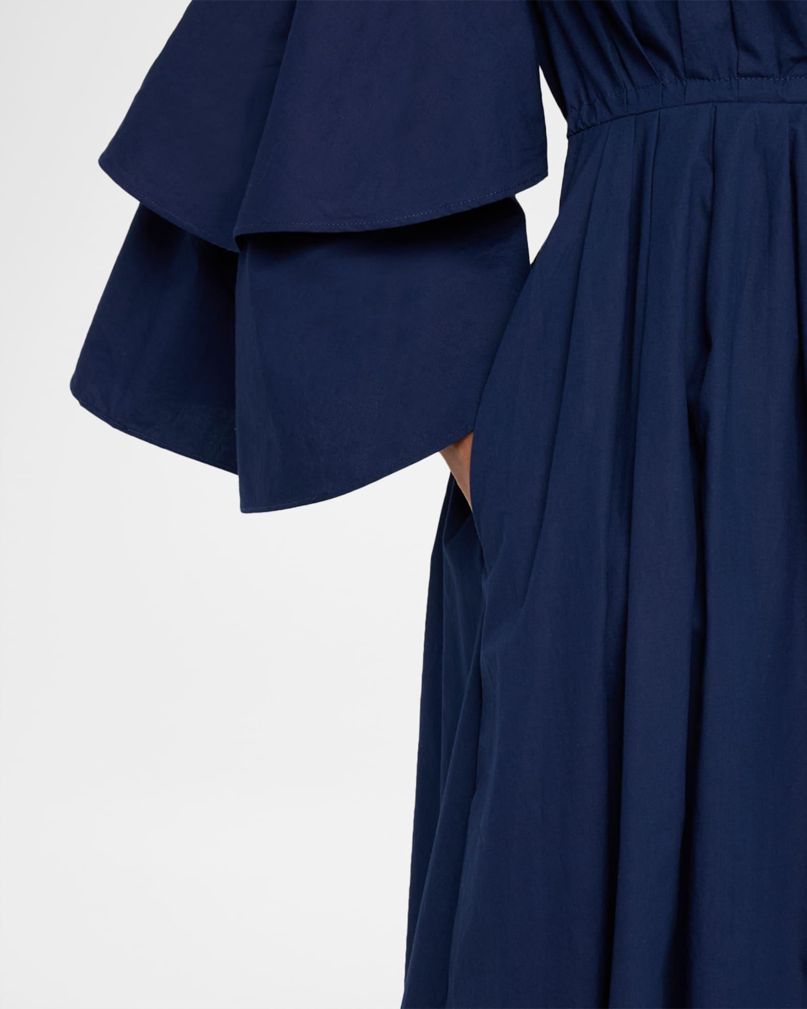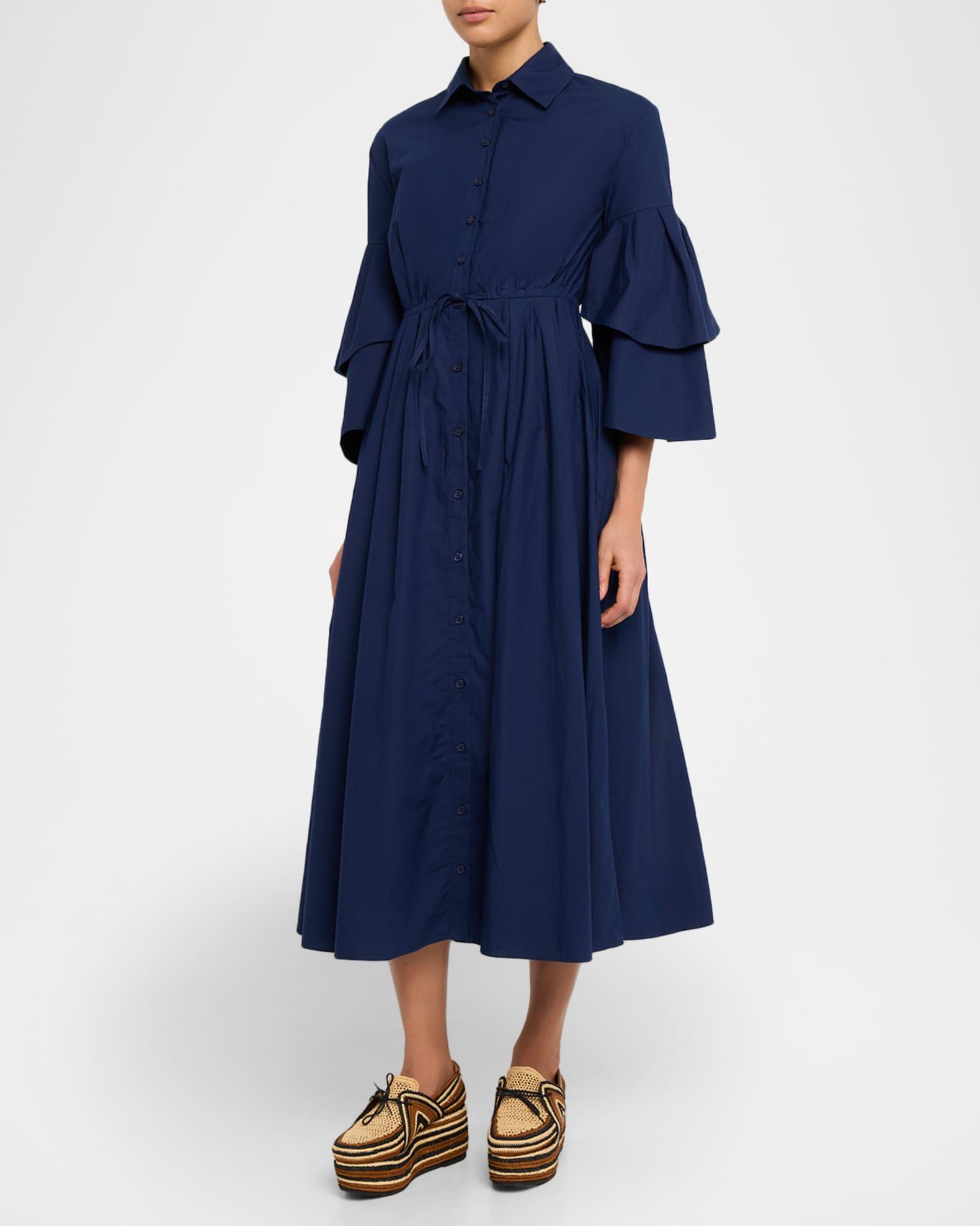 Rosie Assoulin shirtdress featuring tiered ruffle sleeves and a drawstring waist Point collar; button front 3/4 sleeves Side split pockets Self-tie cinched waist Hem falls below the knee A-line silhouette Cotton Dry clean, machine wash tumble dry Imported