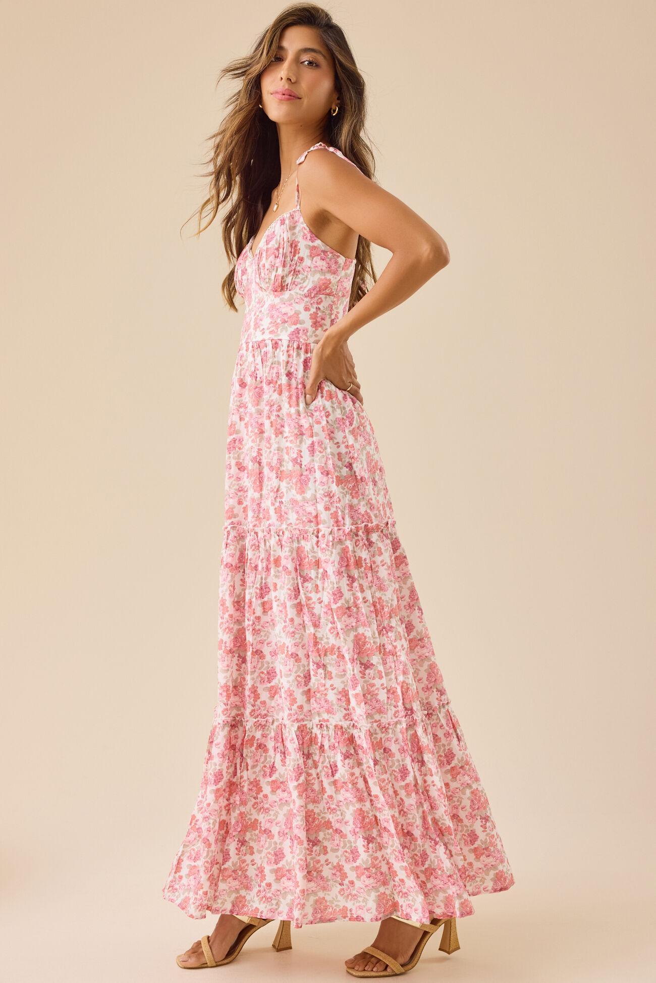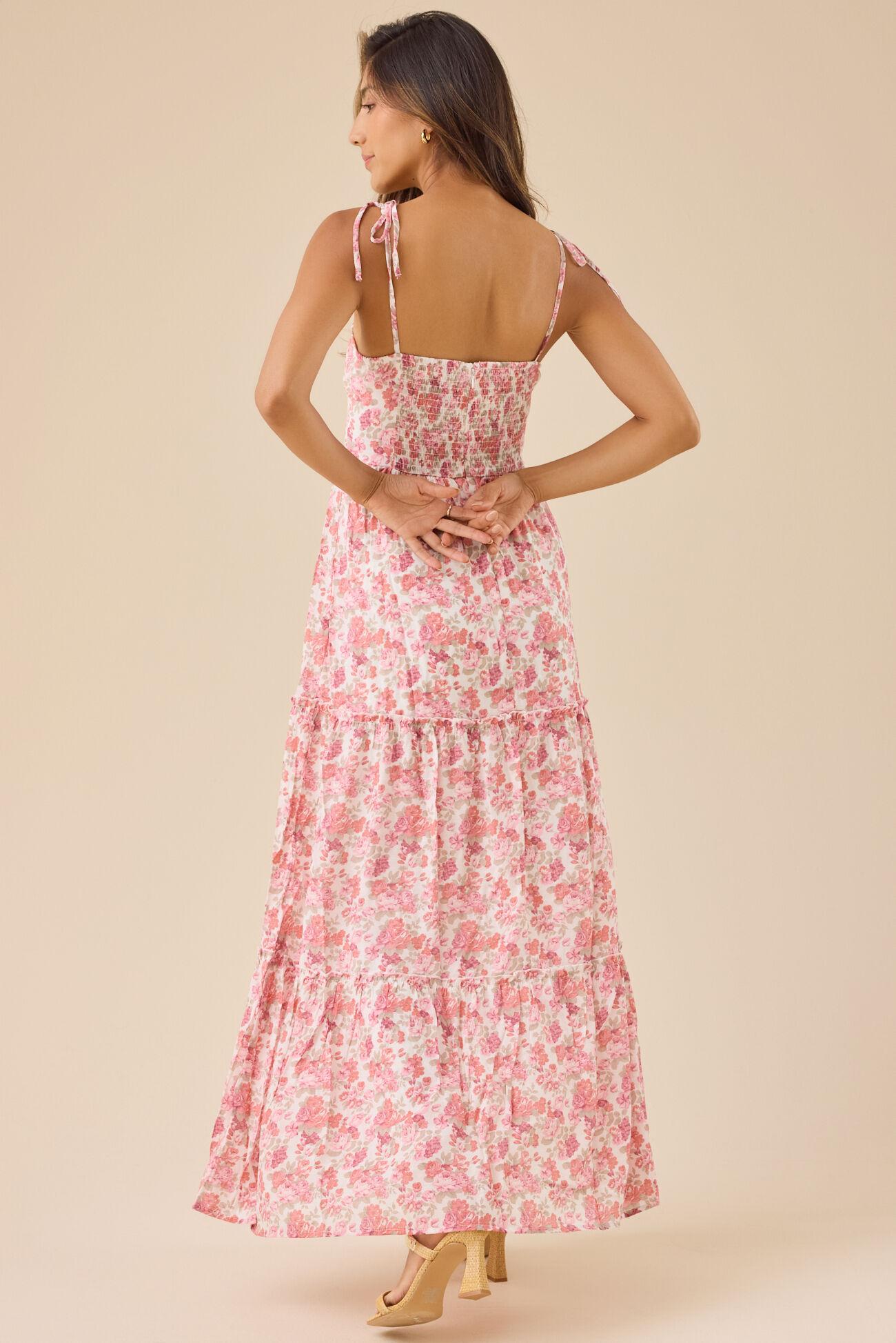 Embrace enchanting elegance with this V-neck sleeveless tiered dress, blooming with a captivating floral pattern and charming tie shoulders.
