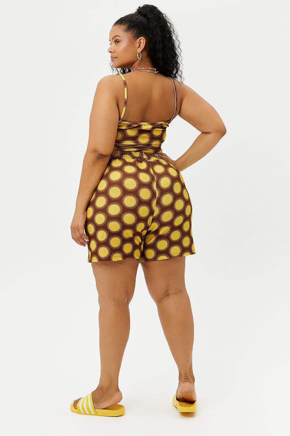 Meet the Fifi shorts. Perfect for lounging around the house or pool, running errands, or even dressing up for a night out. These terry shorts are designed with a cinched high waist fit and finished in our dreamy Golden print. Pair these high waist shorts back with the Courtney tank for an effortlessly cool look. Fabric 94% Polyester + 6% Spandex Terry Fabric This style runs true to size Model Size & Fit Margaret is wearing a size Small Height 5’10” (178cm) Bust 34” (86cm), Waist 24” (61cm), Hips 35.5” (90cm) Leslie is wearing a size X-Large Height 5’7” (170cm) Bust 38” (97cm), Waist 29” (74cm), Hips 47” (119cm)