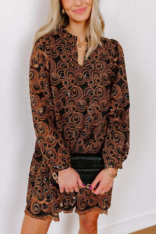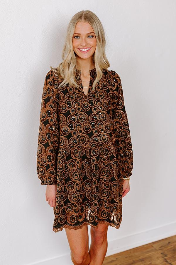 - Add a touch of glam to your everyday style with this gorgeous mini dress! Its sweet charm and delicate detailing make it perfect for shimmering your way through your day. - Material with a swirled crochet cut out design featuring sequin embellishment - A v-cut neckline - Long, unlined sleeves with this cuffs - A relaxed silhouette that ends in a mini dress length crochet hemline