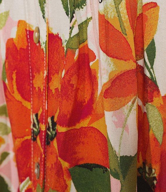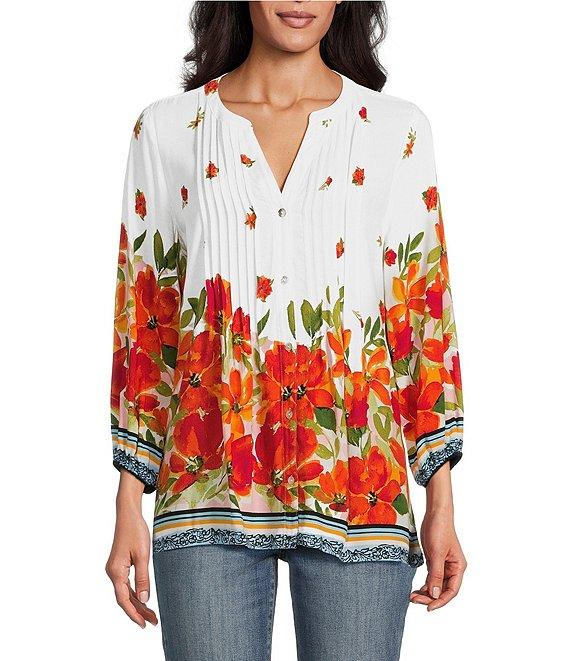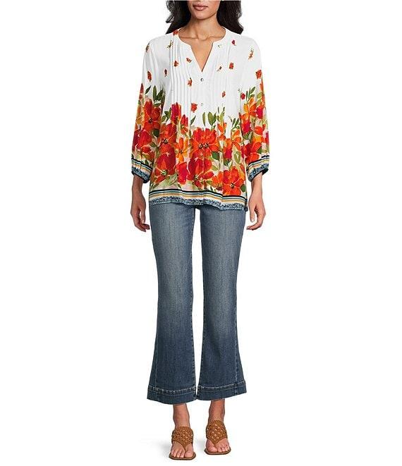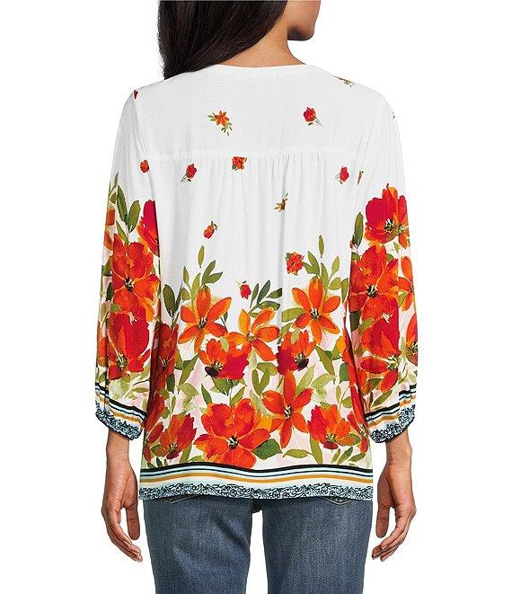 Figueroa & Flower Woven Floral Border Print Mandarin Collar 3/4 Sleeve Button Front Blouse
