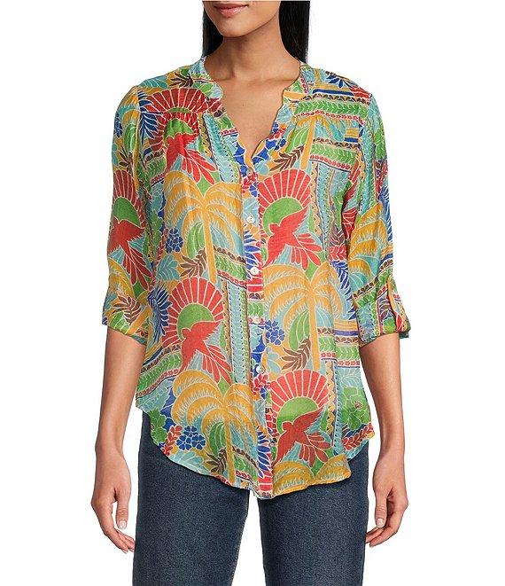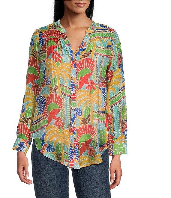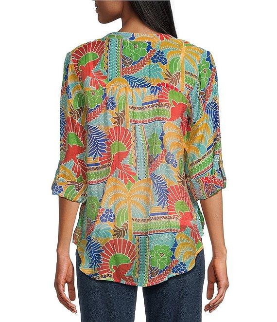 From Figueroa & Flower, this blouse features: Woven fabrication Mandarin collar Long roll-tab buttoned sleeves Mixed print Can be worn tied or untied Button-front closure Approx. 28.75" length Nylon/rayon Hand wash Imported.