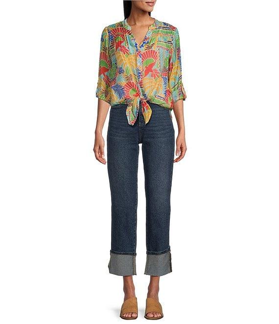 Figueroa & Flower Woven Roxy Printed Mandarin Collar Long Roll-Tab Sleeve Tie-Front Blouse