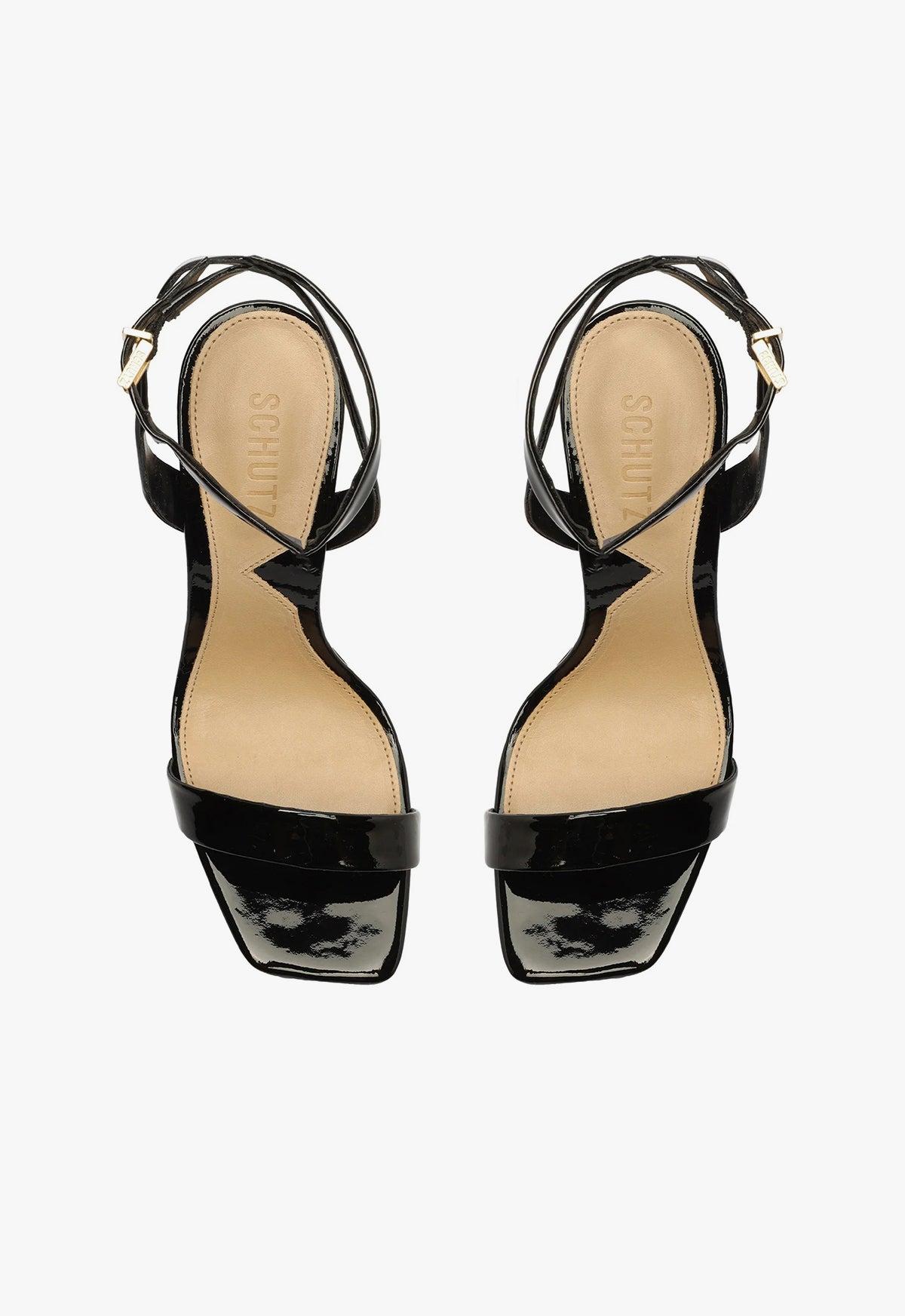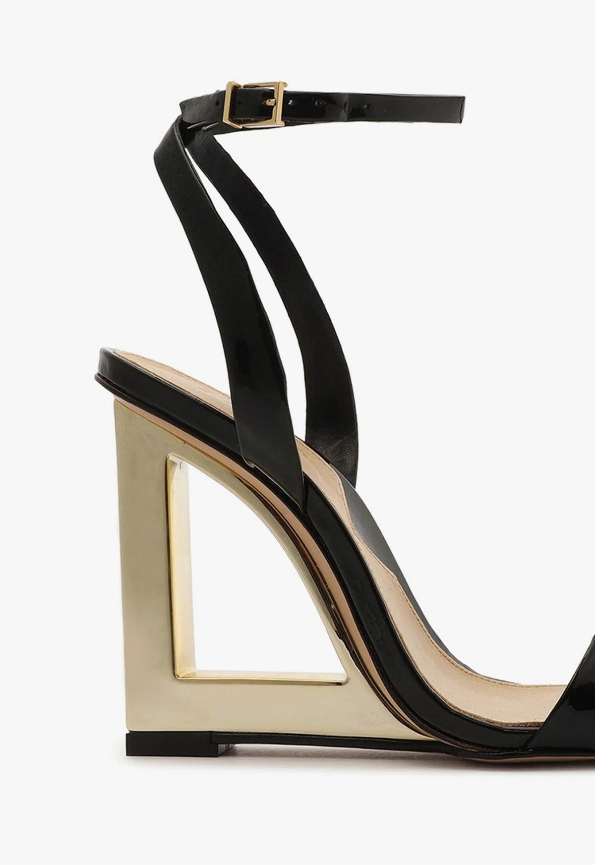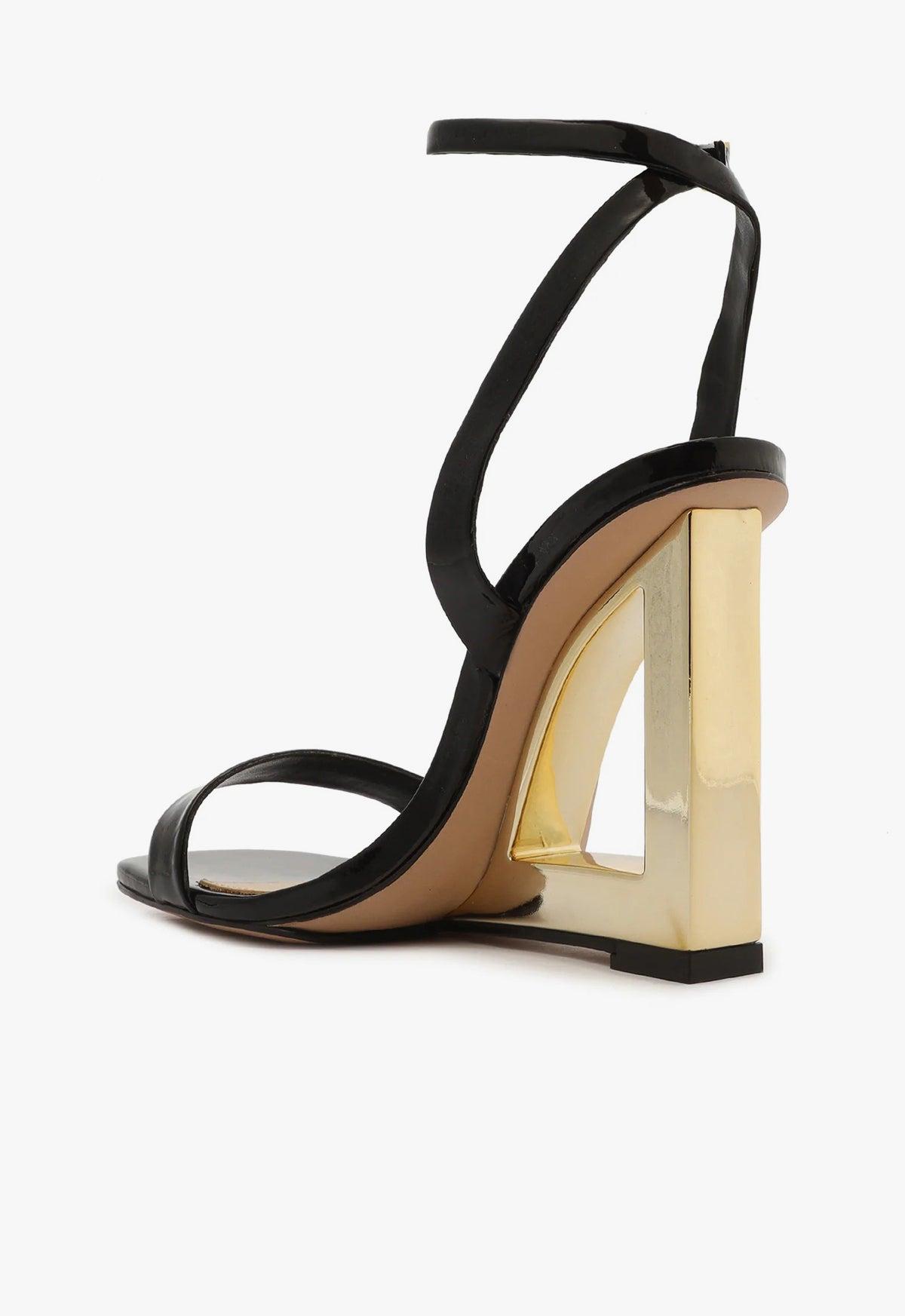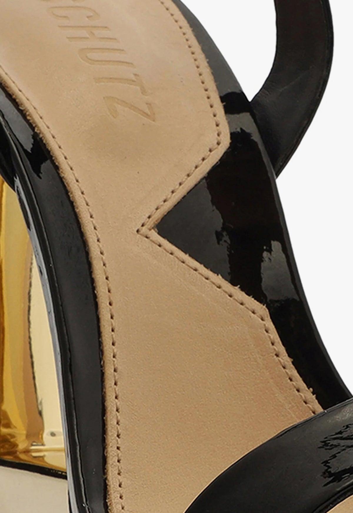 A statement heel defines the Filipa Sandal, crafted from neutral leather with a square-shaped toe. Materials: Patent Leather | Cow leather lining | Cow leather outsole Upper format: Unique strap Heel Type: High Heel Heel Style: Sculptural Heel Cover: Metallic Cover Closure Type: Buckled strap Toe Style: Square toe Counter Type: Open Heel Height: 4.3in | 110mm Rubber patch at the heel. SKU: S2131800010005