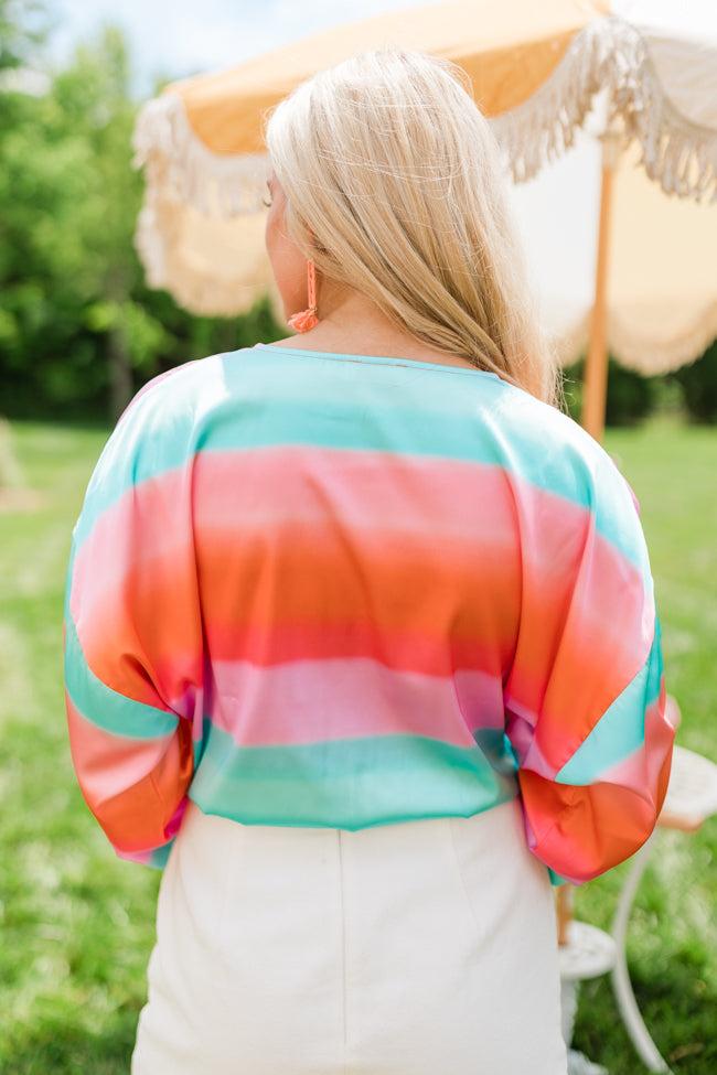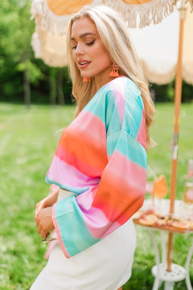 Details Multi Satin Wrap Top Fabric only has stretch in elastic bottom hem V-neckline, functional button closure on bust, elastic bottom hem, long sleeves Pair this top with a cute skort! Unlined Size small from shoulder to hem: 16.5" Material and Care 100% polyester Machine wash cold, no drum drying Patterns may vary Materials may have natural variations Colors may vary from different viewing devices