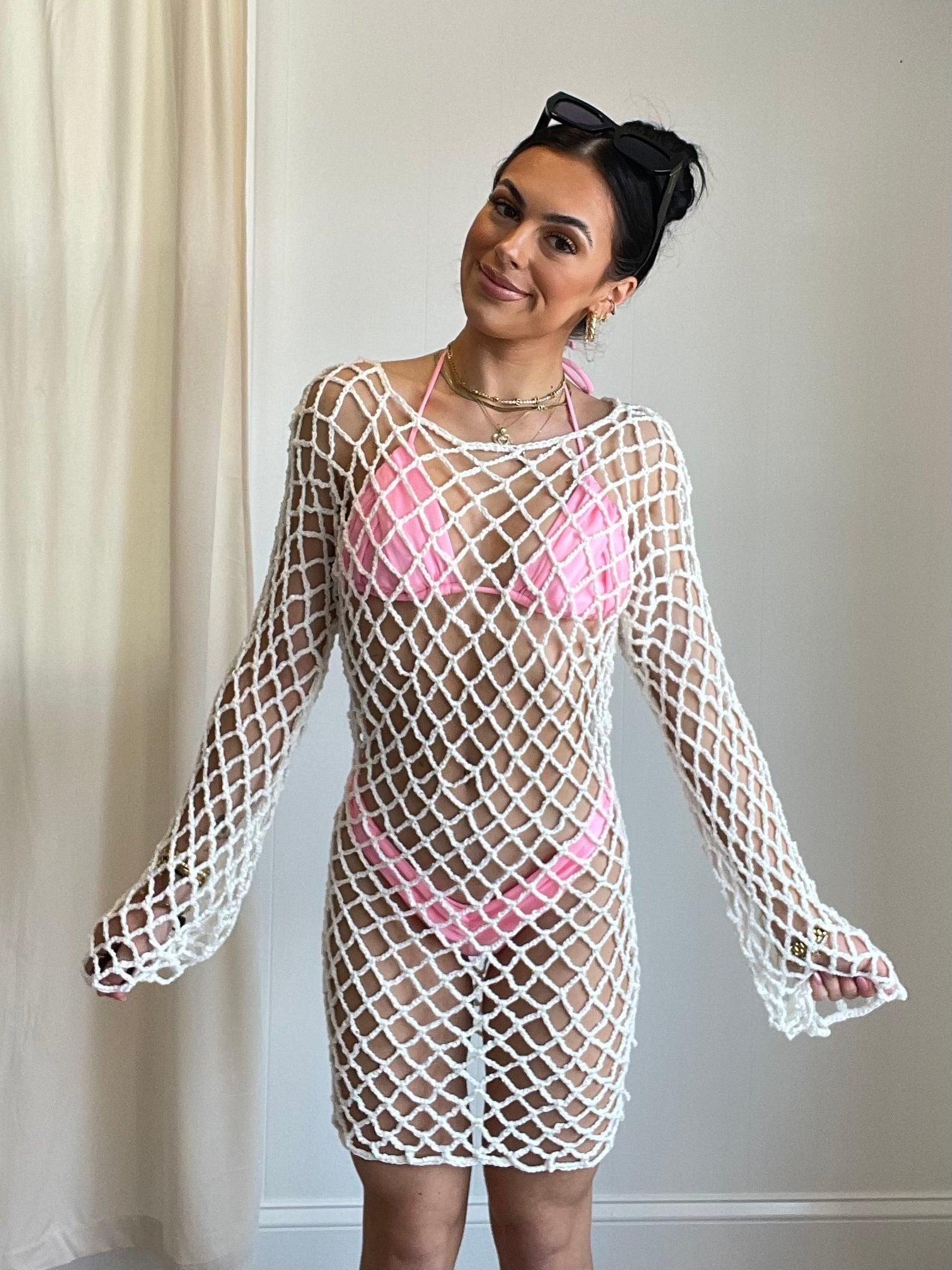 Get ready to stun in the Cleo Cover Up! This playful beach cover up features an open back, sheer fabric, and trendy crochet details for a unique and fun summer look.