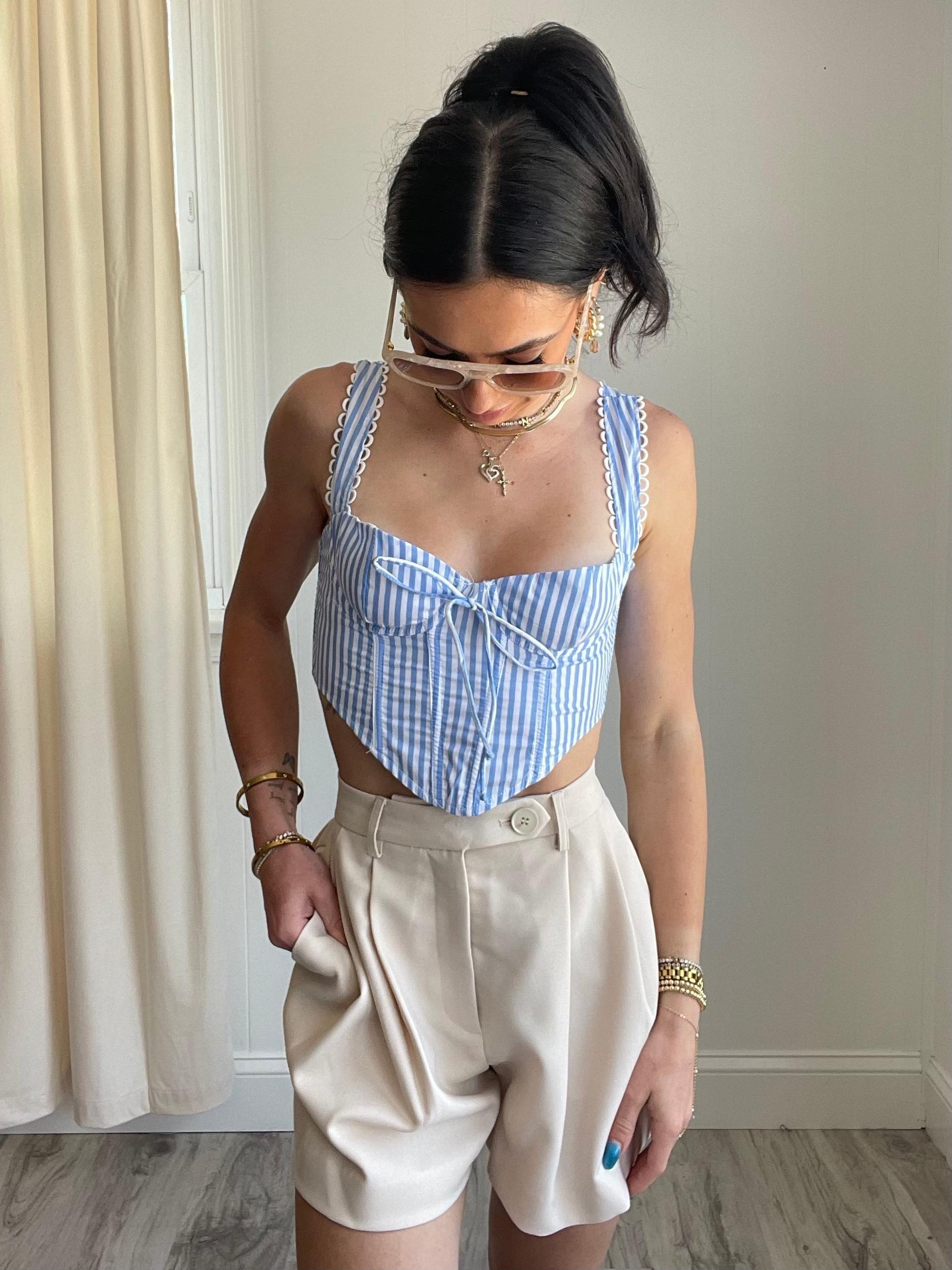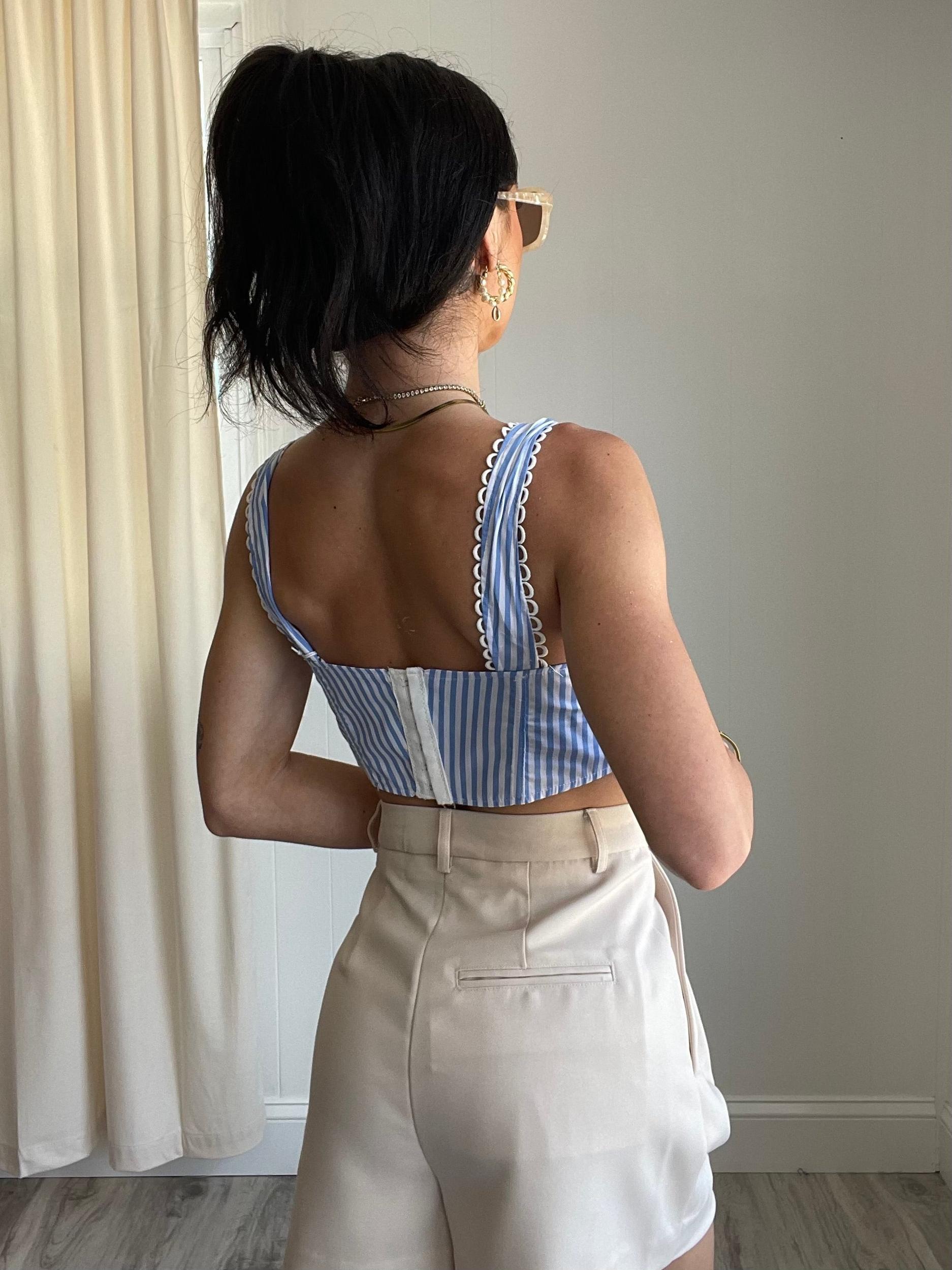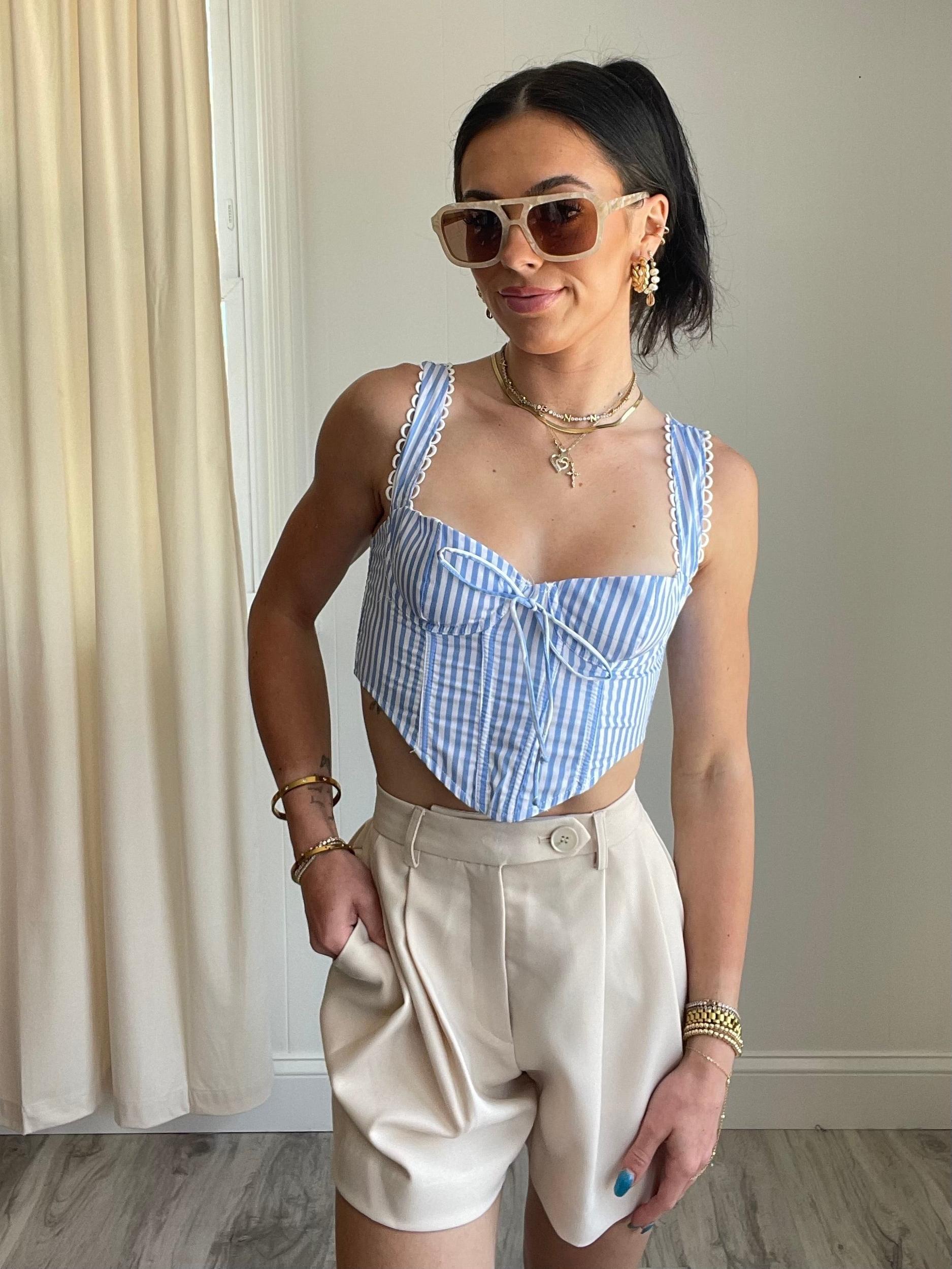 The Gwen Top features a charming striped print adorned with lovely embroidery in a classic blue and white color palette. It also includes a tie front bow and a flattering high low corset-inspired silhouette.