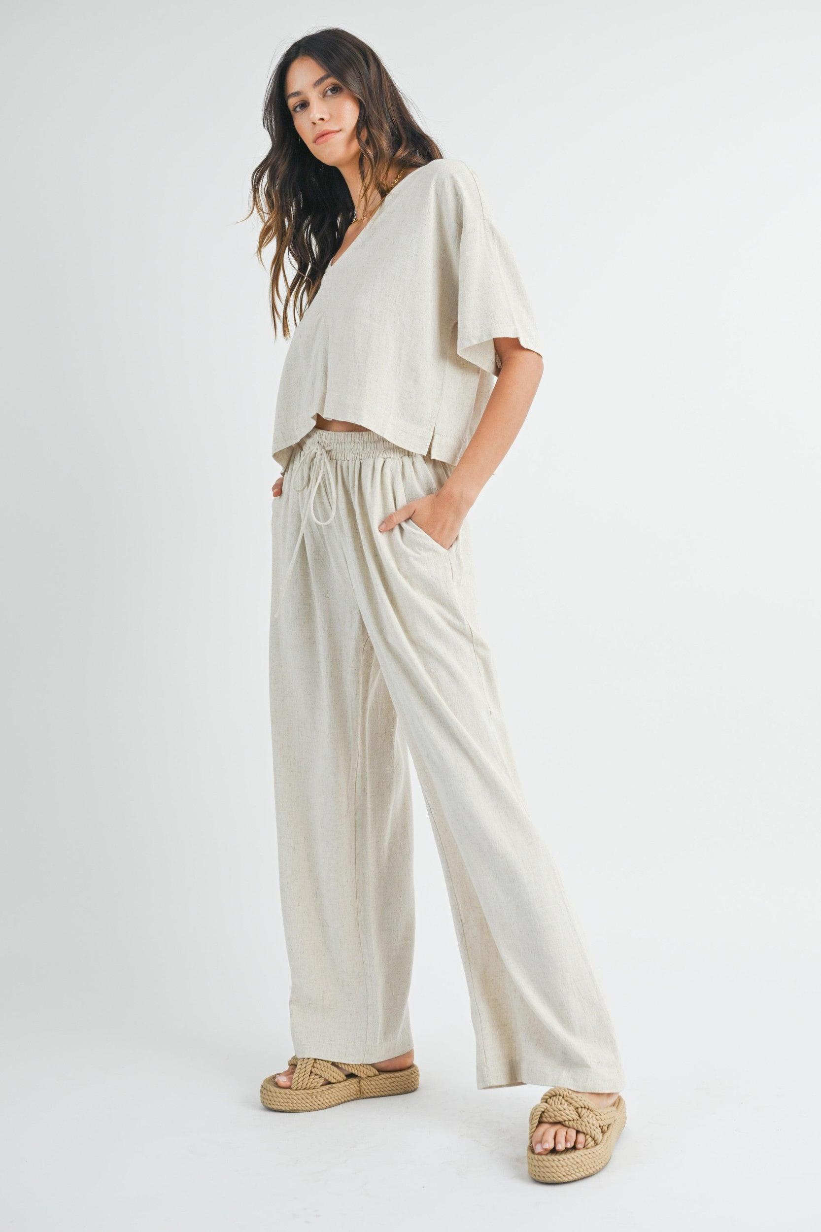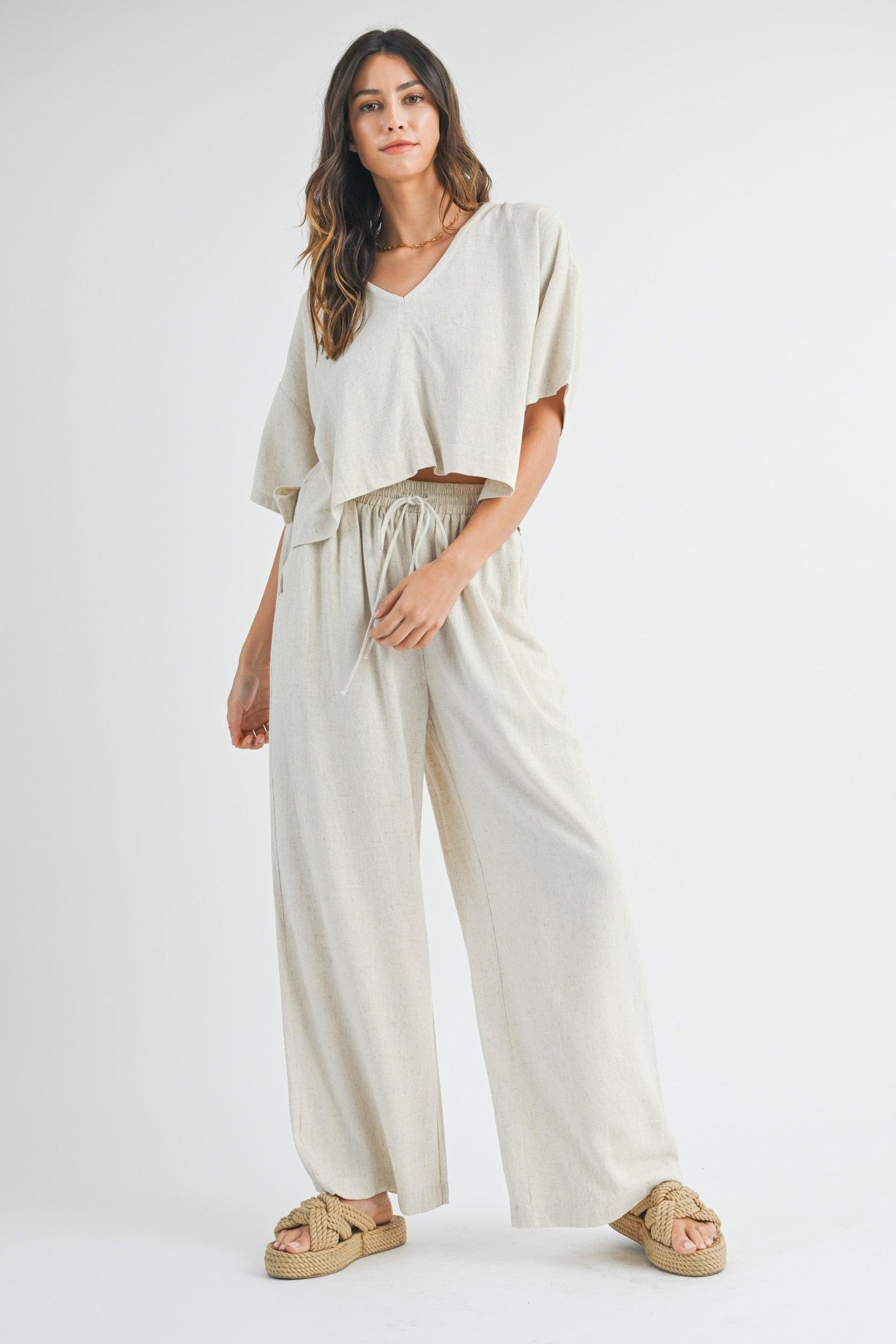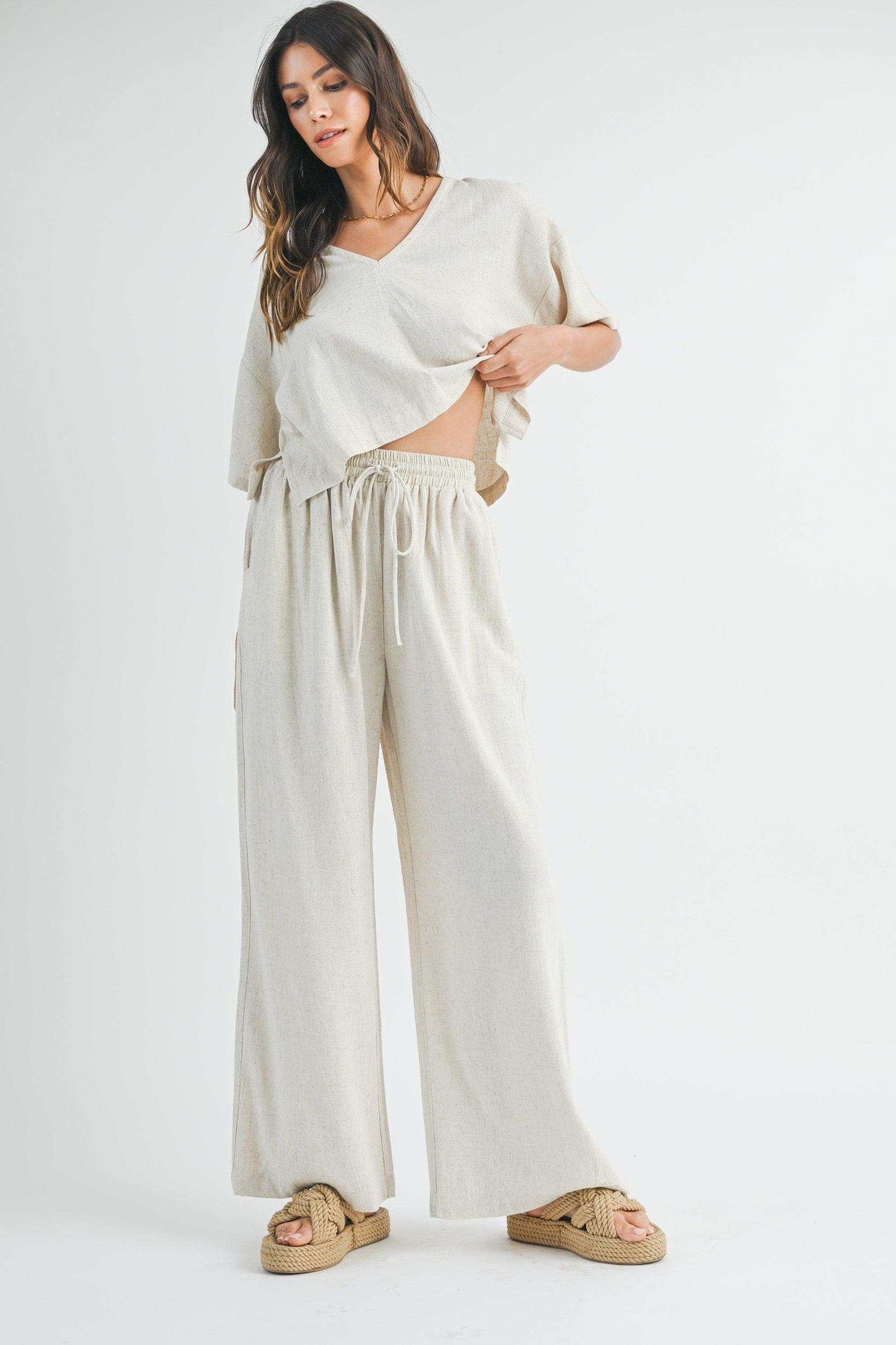 Step out in style with the Madelyn Linen Pants in a chic beige color. These bottoms feature a stretchy elastic waist with a self-tie detail, convenient front pockets, and a wide leg silhouette. Plus, the classic relaxed fit ensures all-day comfort.
