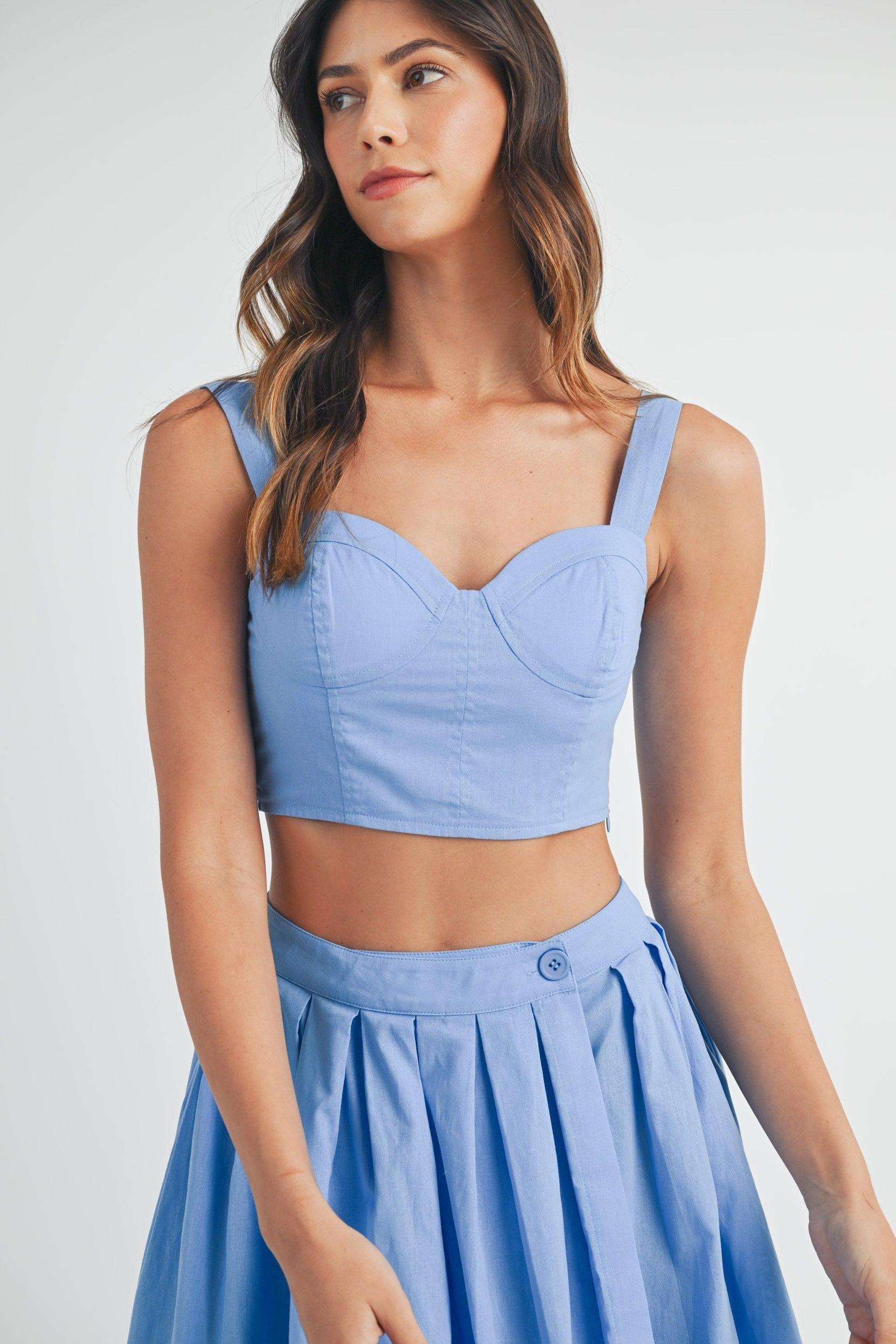 Experience the stunning beauty of the French Blue Portia Bustier Crop Top! Adorned with adjustable straps and a figure-flattering bustier silhouette, this crop top exudes femininity and charm. The smocked back adds a touch of comfort and stretch, making it the perfect addition to any wardrobe.tch