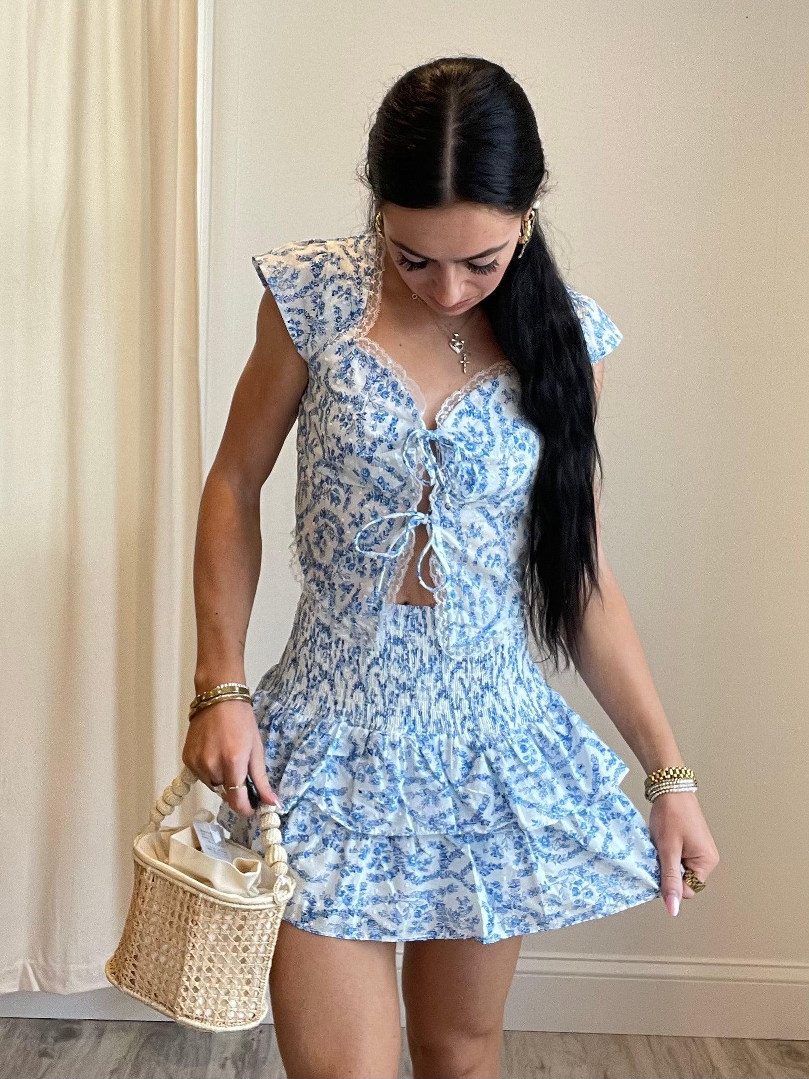 Introducing our Tonya Floral Lace Top - a short sleeve, sweetheart neck masterpiece with playful lace detailing and a charming tie front design, all wrapped up in a gorgeous floral embroidery.