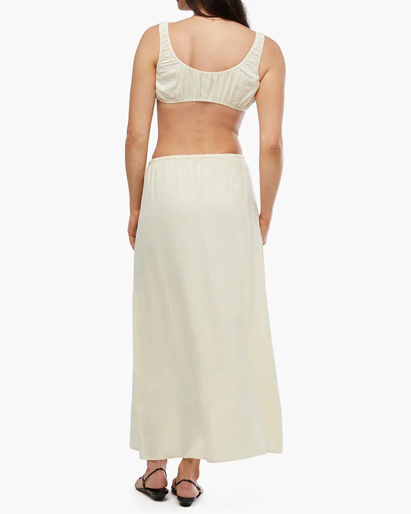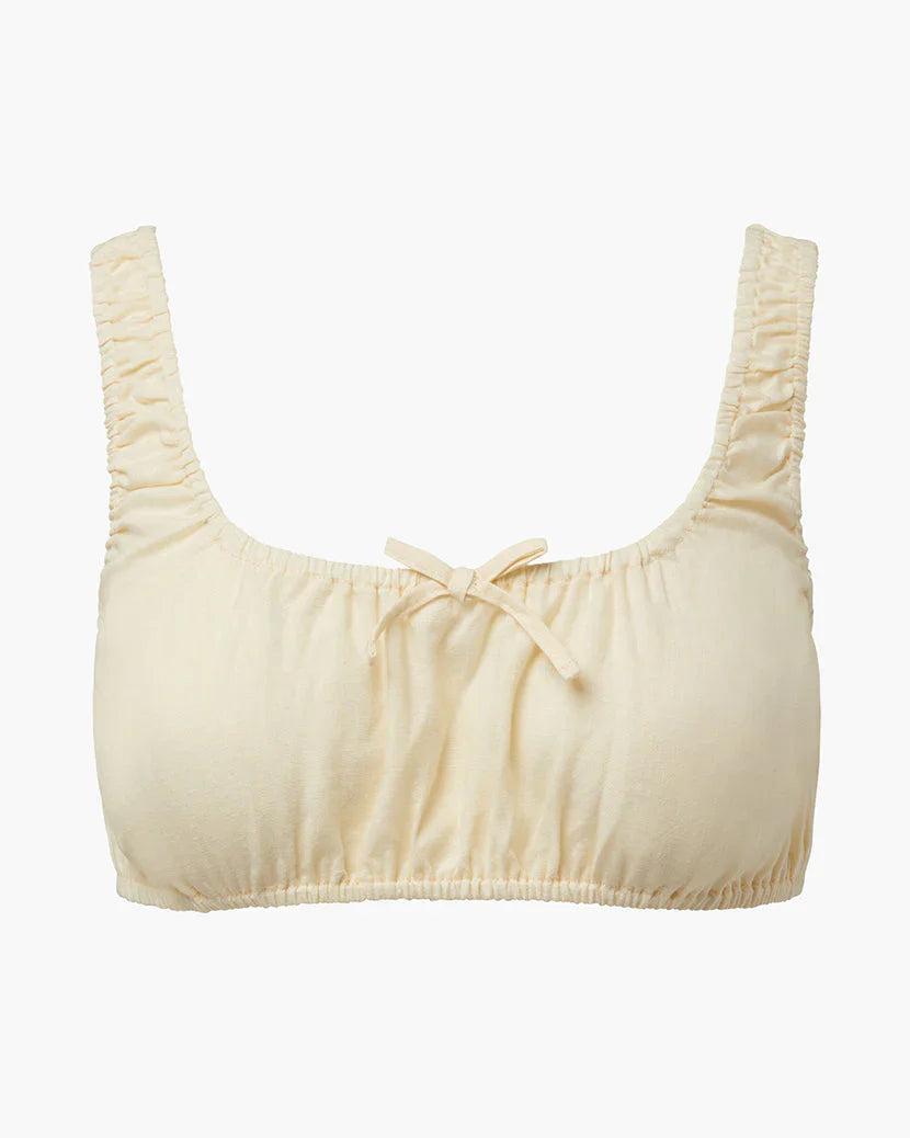 Crafted from our signature linen-blend material, this cropped scrunchy top boasts elasticized edges and a charming center bow.