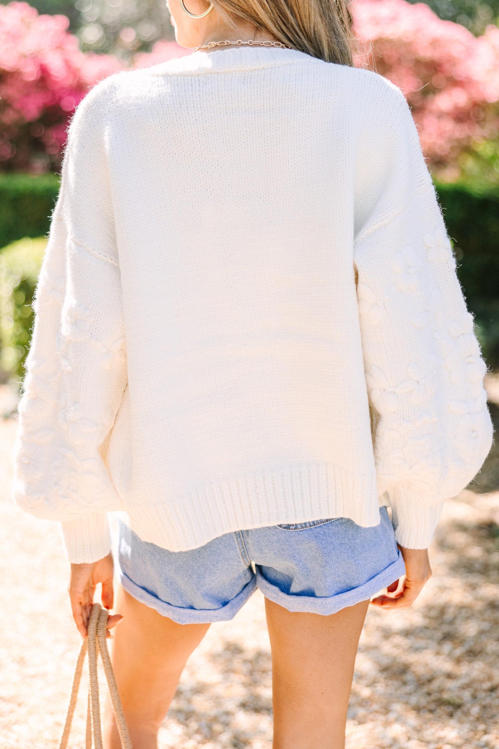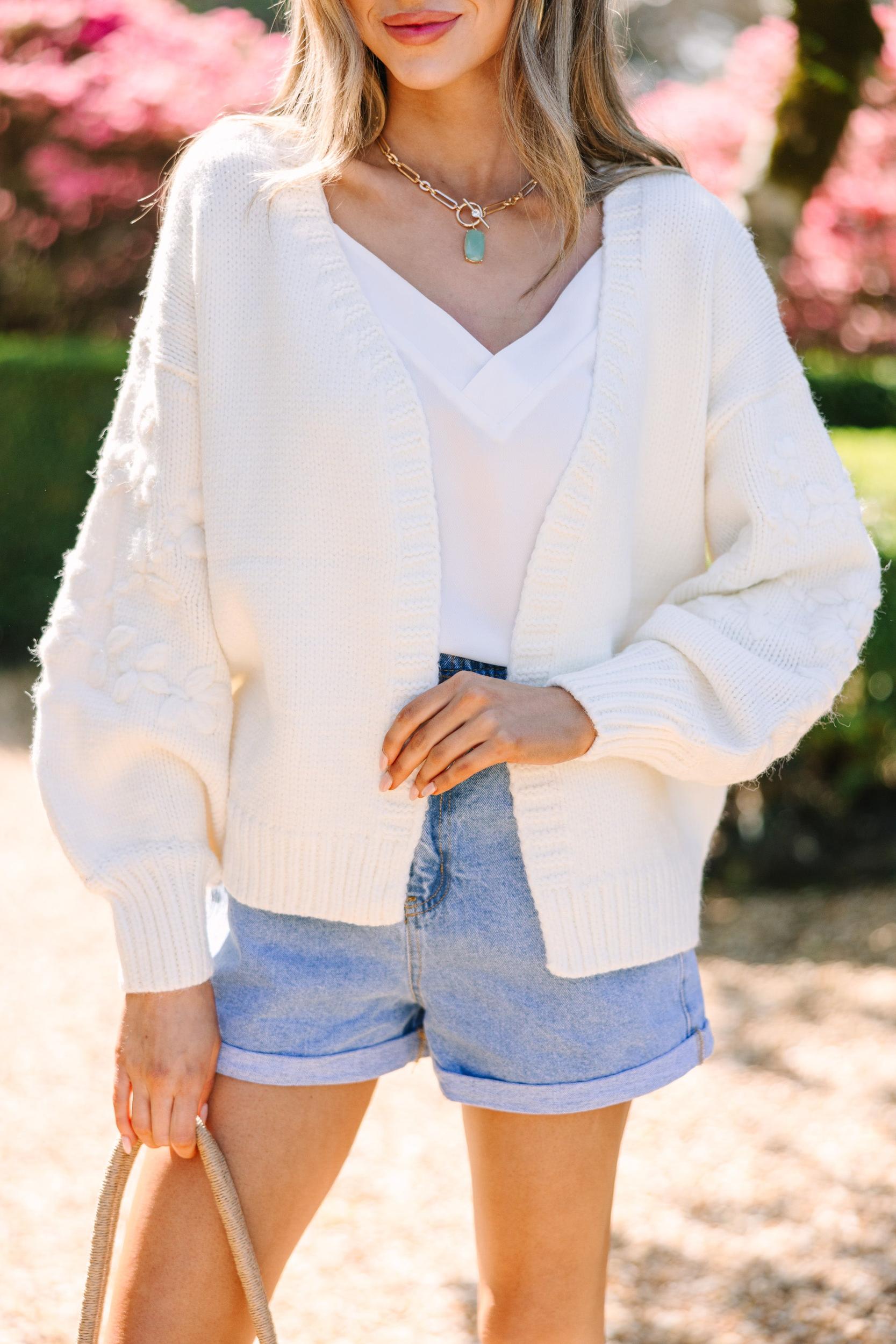 Finally Found You Cream White Cardigan is the cozy cardigan you’ve been looking for! Chunky knit fabric and long bubble sleeves keep you cozy on those chilly spring nights. Looking for something cozy and comfortable that you’ll never want to take off? You’ve found it! This cardigan features long bubble sleeves, thick cozy knit fabric, and knit flowers. Material has a fair amount of stretch.London is wearing the small.