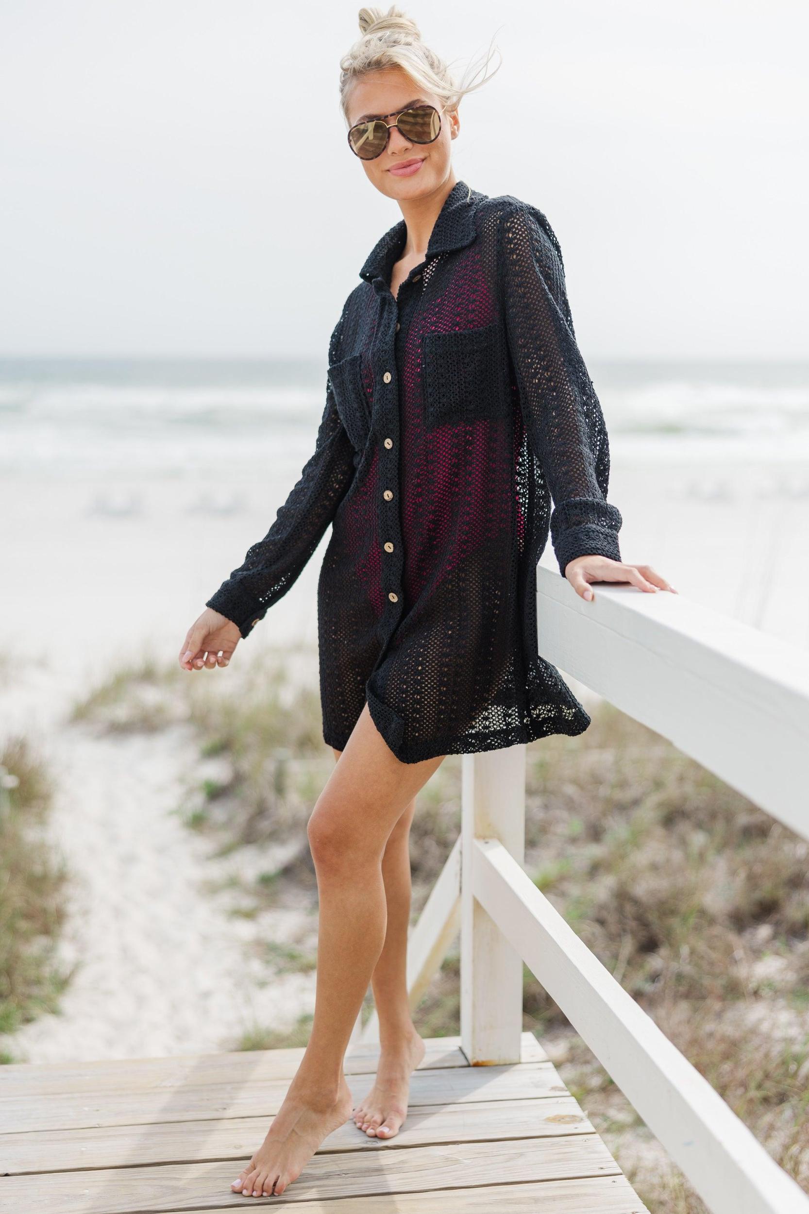 This sheer crochet cover up is just so chic! That button down fit is so chic and we love the long sleeves! This button down cover up is a summer dream come true! Collared neckline Button down front closure Long sleeves Crochet sheer fabric Fair stretch Baileigh is wearing the small.