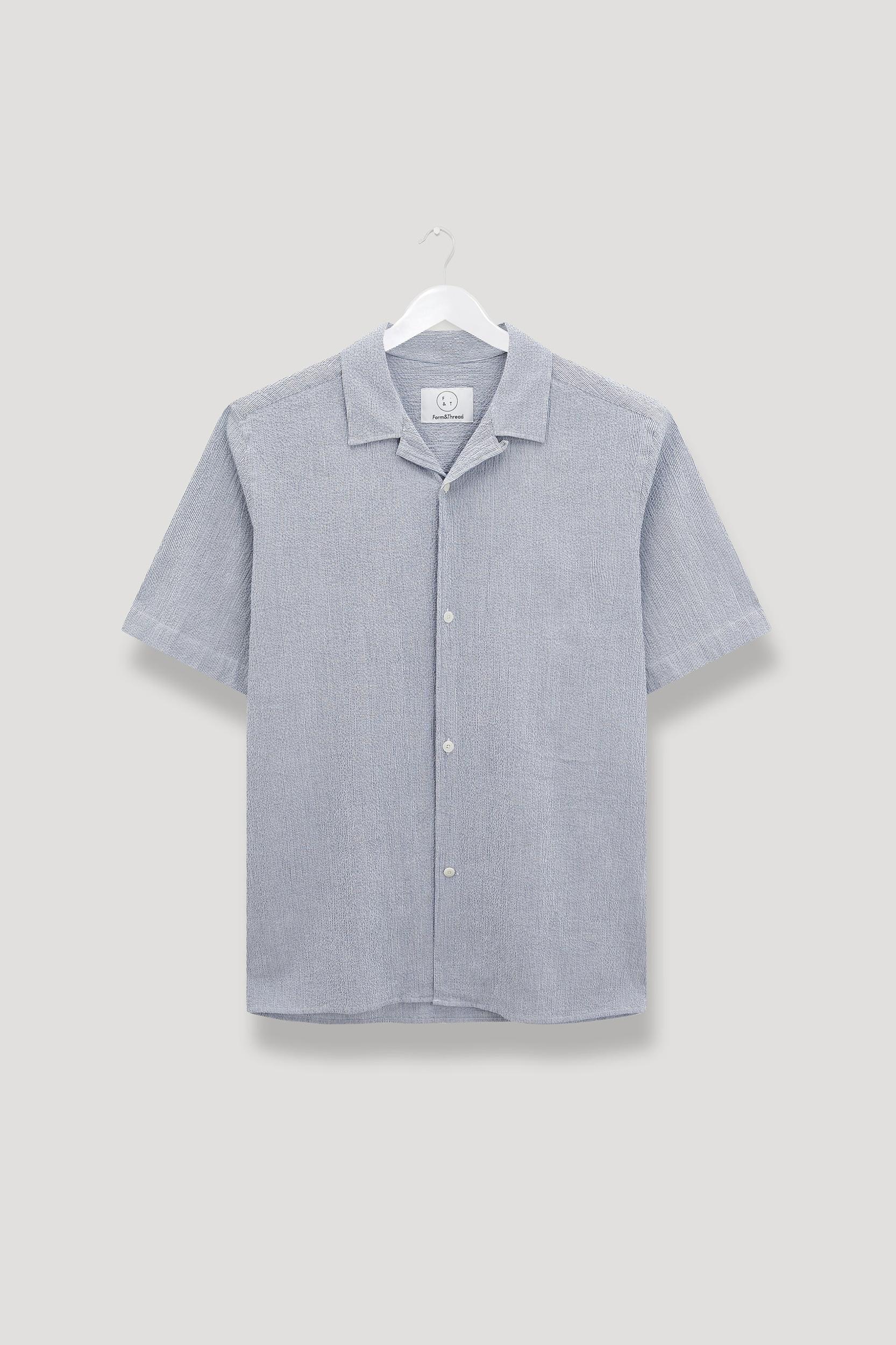 The Short Sleeve Cabin Shirt is a relaxed style, cut in a shape that is straight through the body. Crafted from a beautiful, lightweight seersucker stripe design from Portugal. Detailed with a camp collar and finished with sustainable, corozo nut buttons. Cut for a regular fit. Take you normal size.