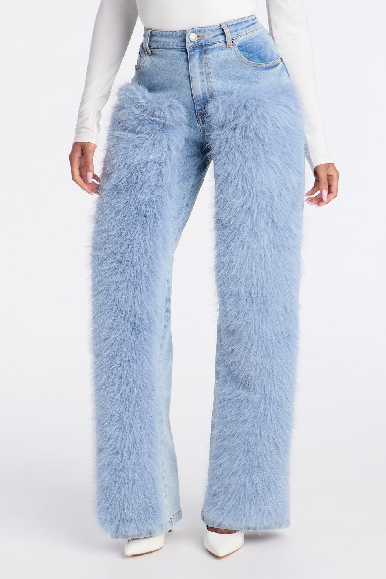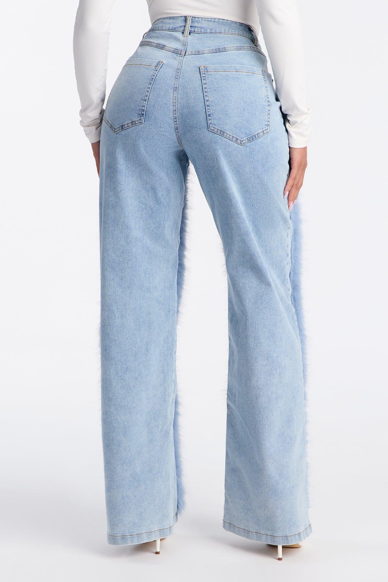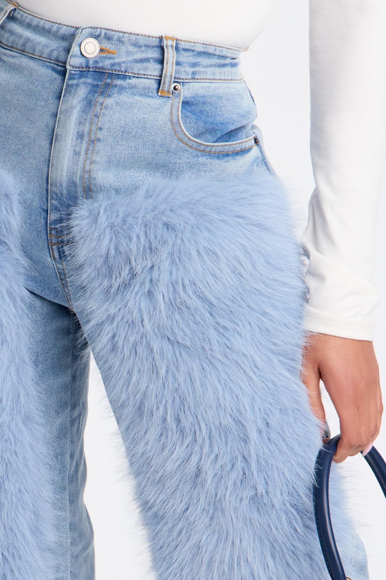 Available In Light Blue Wash. Straight Leg Jean 5 Pocket Faux Fur Trim 11" Rise 32.5" Inseam Medium Stretch Self: 75% Cotton 15% Polyester 8% Viscose 2% Spandex Contrast: 100% Polyester Imported California Proposition 65WARNING: Cancer and Reproductive Harm - www.P65Warnings.ca.gov.