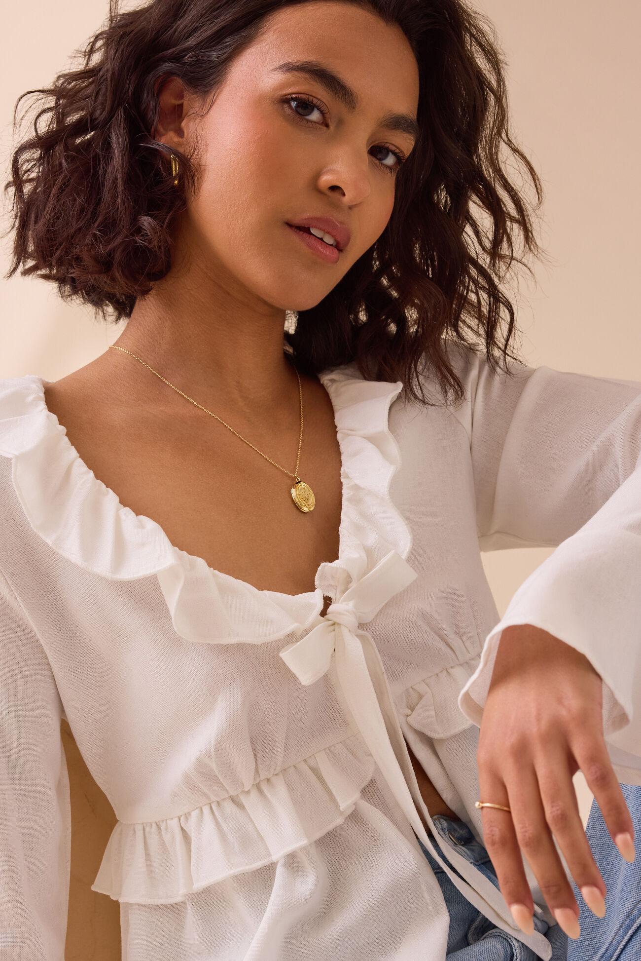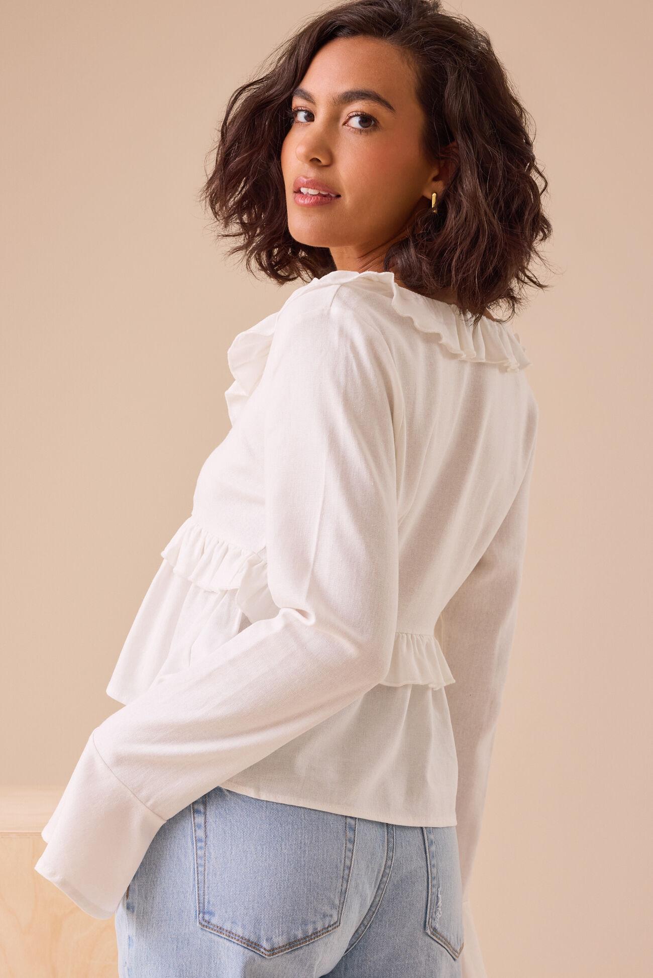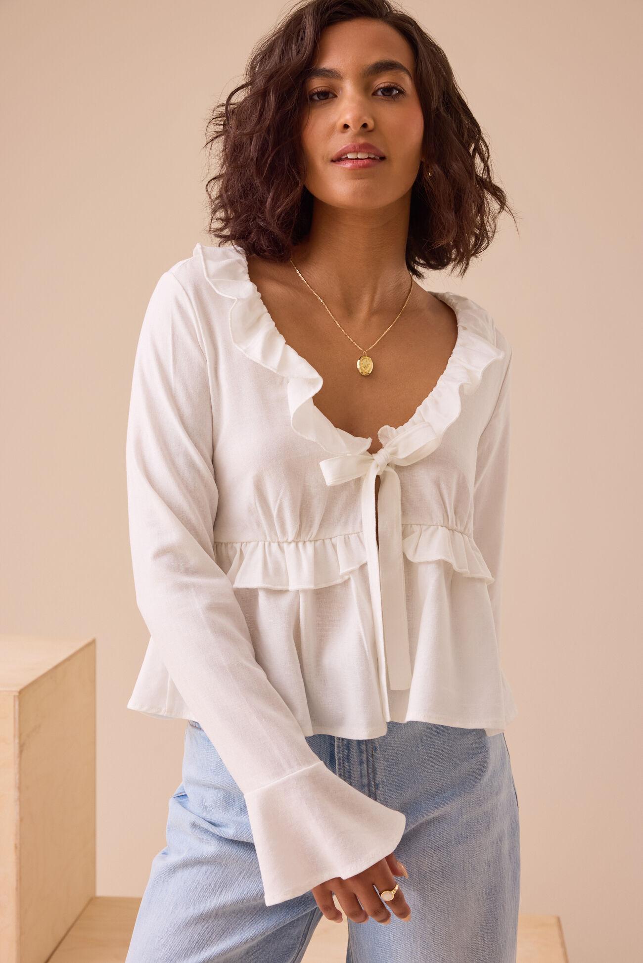 This top is a vision of romantic detail. Delicate ruffles cascade along the neckline and sleeves, adding a touch of soft femininity, while the bell sleeves create a graceful, flowing silhouette. The tie-front detail provides a customizable and stylish finish.